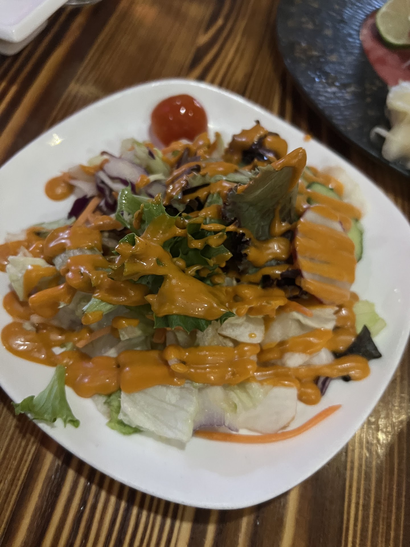 Unfortunately they were out of the lamb carpaccio that night which was one of my usual orders, so we had the Jalepeno Hamachi and Tempura appetizers along with a regular sashimi dinner. The dinner came with miso soup and a salad.