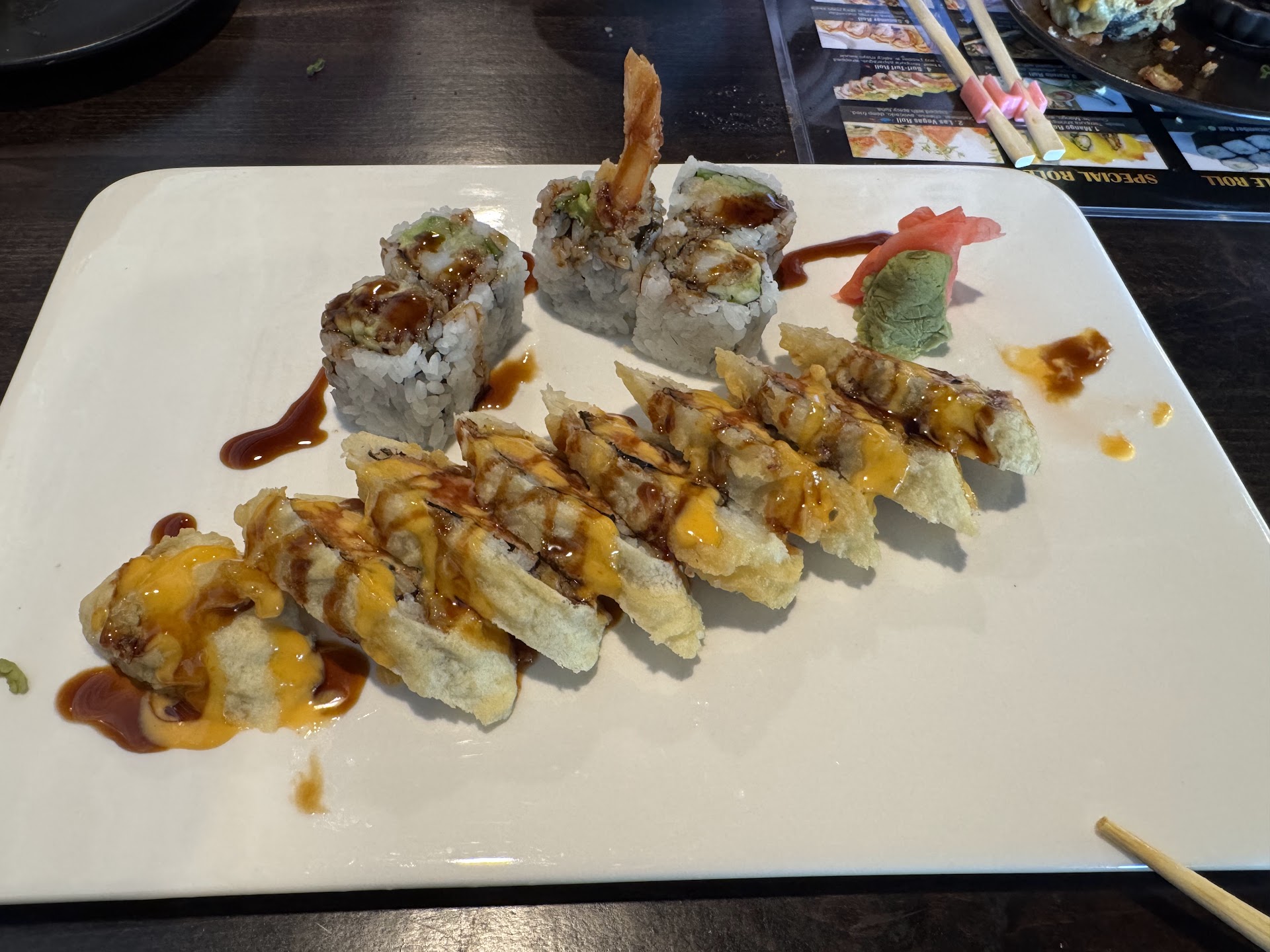 The sushi rolls were great, honestly it’s hard to pick which was the best. The rolls included large pieces of fish or shrimp (some places have paper thin pieces). The plates were pretty, decorated with sauces, leaves, etc. Sorry - didn't include photos. Everything looked delicious and we dove right in.