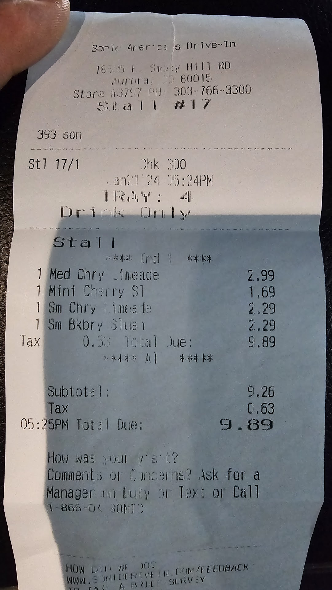 Read moreThe recent good reviews with no actual verbiage must be either fakes or posted by customers without tastebuds. I'll never go to this or any Sonic again after tonight's experience. My boyfriend and I pulled into a stall, rolled down our windows, and were immediately greeted by a half-dozen flies; flies were a constant annoyance the entire time; it was pretty nasty. We placed our order without issue or significant wait, but the bag was missing an entire meal. Okay fine, mistakes happen, no big deal. The employee delivering our food had walked away by the time we discovered this, so we pressed the red order button to report the missing items and waited -- for ten minutes, at which point the ordering screen reset, without anyone ever acknowledging us. By this point we're aggravated. We get in the drive-thru line and wait another ten minutes until we can speak to a human. When we explain what happened, the Sonic employee SERIOUSLY asked if we'd "checked the bag." Really?! We roll up to the window and they finally give us our missing meal with the most perfunctory apology, and by forty minutes in we're eating $40 worth of Sonic "food," about which the best I can say is you probably won't be hungry anymore after eating it. I asked my boyfriend what he thought of his meal, and he replied, "Man, I'd have to be really drunk to enjoy this." So yeah, unless you're too wasted to care what you put in your face,...