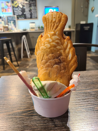 We paid for the Taiyaki at the same time as the meals but asked them to make it later after we ate dinner so it would be properly hot/cold... the best Taiyaki!! ❤ cute baked fishy shell (choose Nutella or Red Bean, we chose Red Bean) + delicious soft serve ice cream🍦 (flavors this week: Blueberry or Wintermelon, we chose Wintermelon) + small squares of mochi + strawberry pocki stick. My hubby was super duper full yet finished...