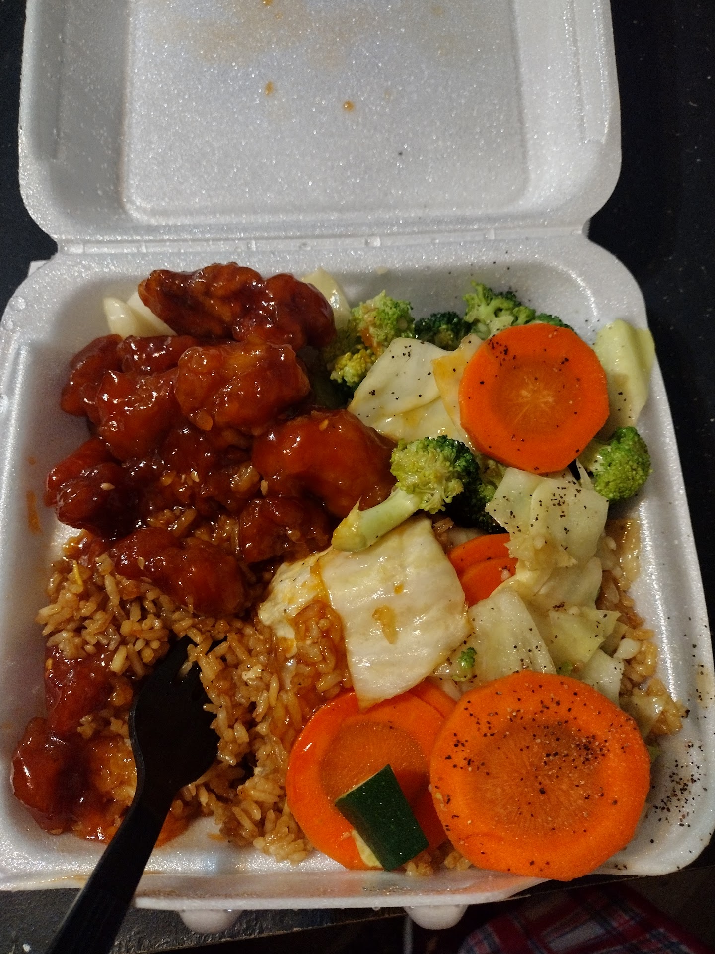 Everything was hot and delicious, once I had made the 1.2 mile trip home and had the ice cream (Aldi) in the freezer. As stated above, the crab rangoon was gone first. All the veggies including zucchini, carrots, broccoli, onions, peppers and green onions were cooked, but still crispy. The sauce was flavorful and fresh tasting with no hint of anything artificial.