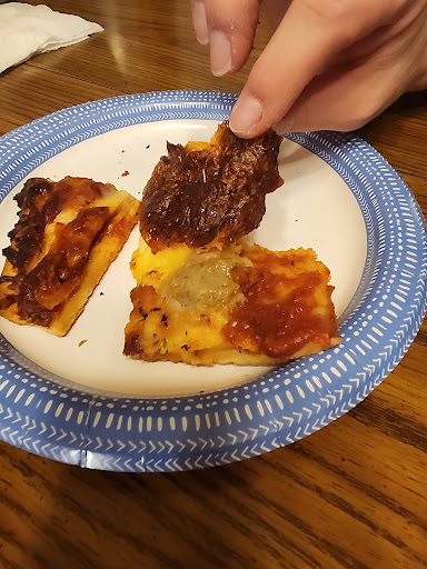 The pizza looked interesting upon initial inspection. It clearly had somewhere in the neighborhood of seven or eight hundred pounds of cheese on it. That's an exaggeration of course, but it had a LOT of cheese. So much that once the cheese cooled a bit, we were legitimately afraid someone would choke on the cheese.
