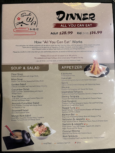 Read moreGreat menu, prices, and service! The menu is extensive with more than just sushi. It includes hibachi, yaki soba, etcâŚ; things that are not typically on an all you can eat sushi menu. Ordering is comparable to similar establishmentsâŚorder something and once you finish you can order more. You can actually take leftovers home for an up charge, but I didnât catch how much the charge was as there was a slight language barrier. Note that most all you can eat places will not let you take leftovers home and actually charge extra for not finishing the items you ordered. The server was attentive and timely. Highly recommend and look forward...