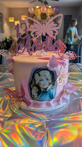 Read moreThis was our 3rd cake from Sweet Retreat and we've loved them all! I reached out through messenger and received an almost instant response. She was excited to do the cake and was a joy to work with. I showed her the Dolly Parton themed stuff I was working with, gave her complete creative control, and was so happy with the results! My Dolly cake topper didn't arrive on time, so she was able to make an edible image and attach it to the cake saving the day! Everyone was raving about how beautiful it was and how delicious it was. The cake was very structurally sound, had super thick layers of Oreo cream, and was absolutely beautiful. The Oreo layer is a thick pudding-like consistency, yet somehow thicker...it's sooo good! After several hours, a third of the cake is still standing...I have no idea where the 1 star reviews are coming from. Our experiences have been amazing from start to finish over the past 3 years. We will...
