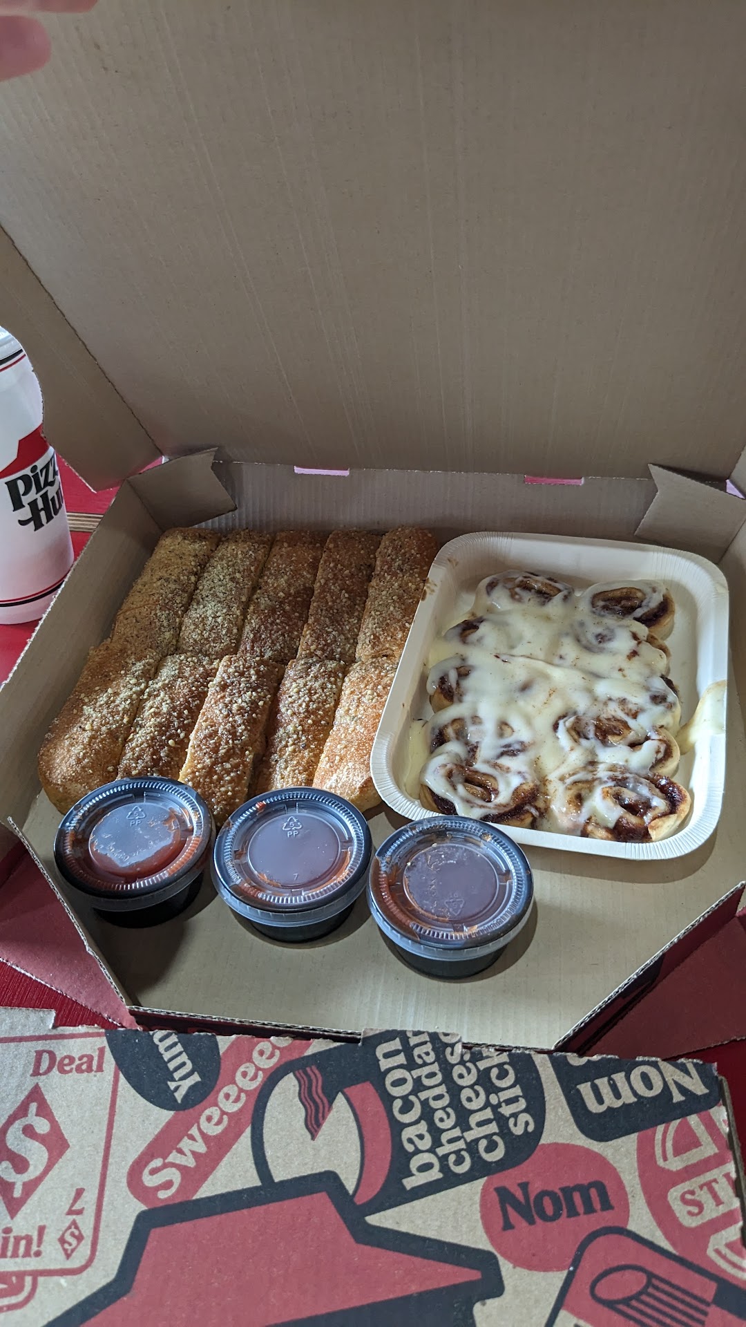 So we eat here frequently and I'm so disappointed. Breadsticks and cheese sticks come with 1 per order. So we add sauces to our order which costs about 2 dollars for 2 extra sauces. Everytime we pull our food through the window and check we don't have sauces let alone our extra ones. Now granted we are still at the window and can correct that but they say they checked it and sticker the box now for covid safety. Wonder how many people have gone home without their sauce. It took once for us to start looking and glad we do. Also cheese sticks should have cheese on them not cheese on one stick and sprinkles on the others...