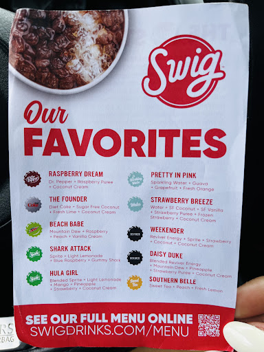 Read moreI tried Swig for the first time 2 weeks ago. I placed a order via drive thru. The rep was very friendly & was patient with my indecisiveness. Haha! I had a Poppin Pineapple drink made with Spite and strawberry popping pearls. It was actually my first time trying popping pearls & they were really good! Also fun to have in a drink. I also received a free cup of cookies. I was disappointed as the cookies were cold straight out of the fridge. They were also undercooked so I had to go home & pop them in the oven for a few. Then they were warm & tasty! Not sure about the atmosphere, as the inside wasnât open. Iâd definitely give Swig a try again! Maybe not the cookies but definitely one of...