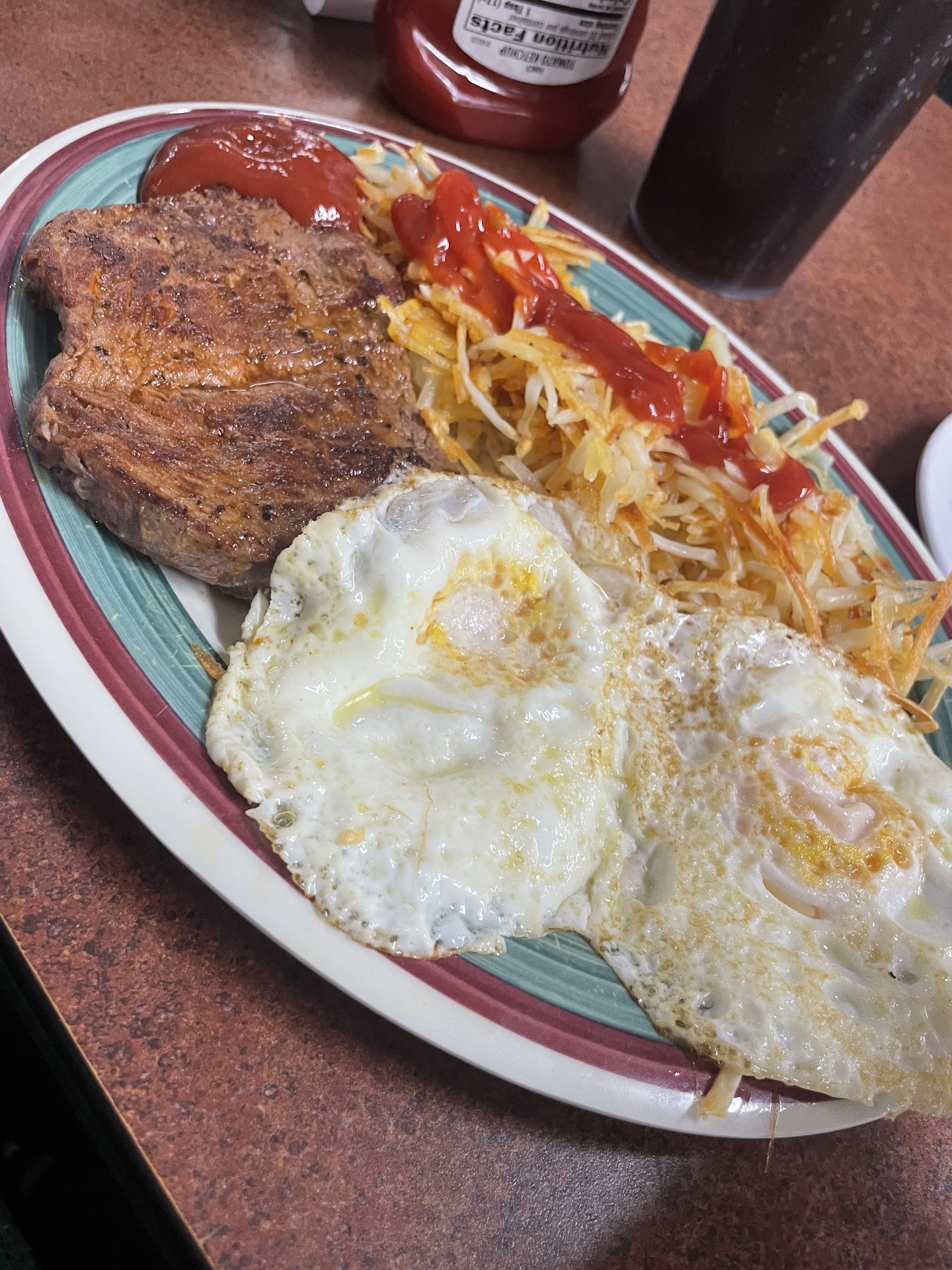 Read moreClassic small town country diner. I had one of the best omlettes I've ever had. Three eggs fried almost as thin as a crepe, then absolutely stuffed with chopped steak, mushrooms, onions, and cheese. Has browns were crazy good, crisp around the edges, soft in the middle. My order took two plates, the hash browns and toast on one plate and the omlettes another. Both plates were full. My wife had the same. That with one coffee and one orange juice came out to a little...