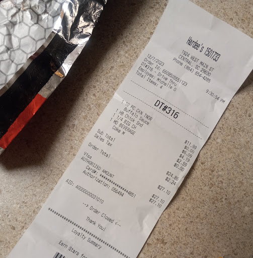 Read moreI never post reviews of places, especially bad ones but this is ridiculous! I just got home from working a 10 hour day, and still had errands so I was starving and decided to try their new Bacon Cheese Fries. The picture on the menu and all over the internet shows the fries are regular fries. I honestly hate Hardee's curly fries especially the seasoning they use so I got excited that it was used with their normal fries. I was wrong! Apparently with nobody else in line and only one car in the lot it takes over 10 min for a small bacon cheese fry and they didn't even do it right! I got home and opened up a barely bacon cheese curly fry. I just don't understand this Hardee's location. They NEVER make anything right. I live across the street and my family gets Hardee's from time to time....8/10 times it's horrible. They mess the order up like none other and make you wait forever before getting your food.