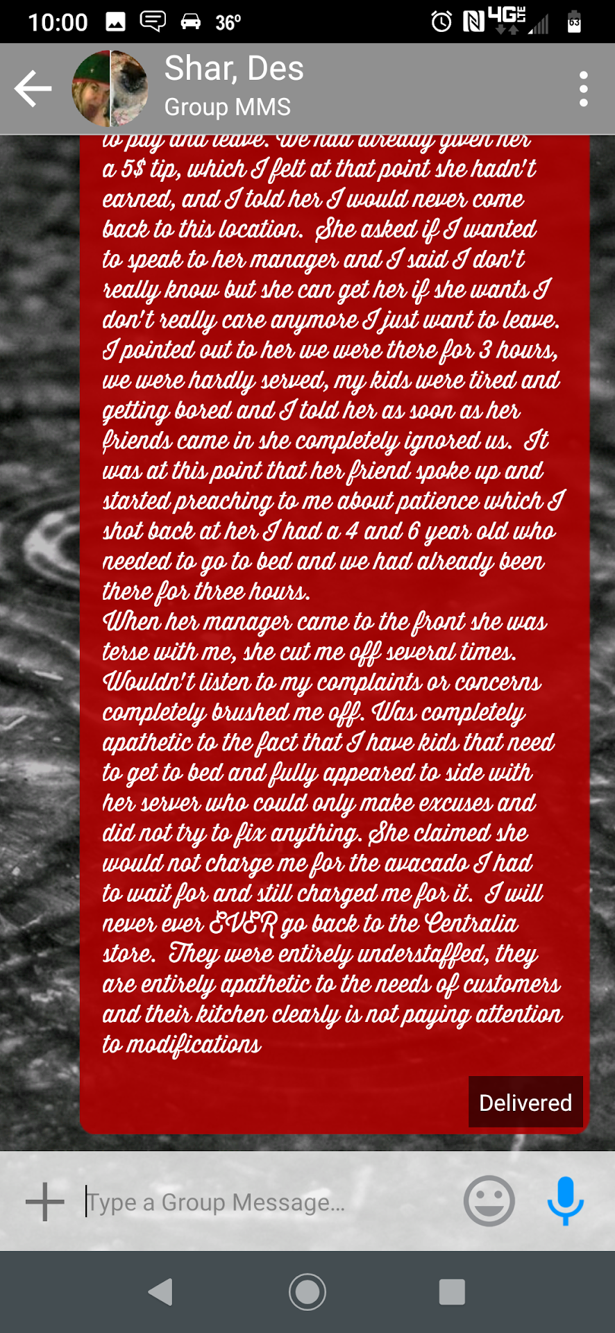 Store #: 7541 Manager on duty: Leanna Server: Kelli H The location I visited tonight gave us deplorable service and I will not be going back. There were only 6 of us tonight (so half as many as last week plus 1). I again had my 4 and 6 year old. When I got there my 4 year old was very hungry. We got to the restaurant at about 6 pm. In the first place I made a comment where they were seating us because it was right in the breezeway and I don't like sitting near a bunch of foot traffic and I like having my kids in a booth so they can't just get down and run around if so inclined. The only accommodation I was offered was squashing all six of us in a 4 person booth. That is my first time being ignored/brushed off. The first thing I noticed is they were extremely under-staffed. Kelli had a whole section to herself and shortly after we showed up a huge reservation was scheduled. So there was another thing on this one server when she was already over-extended. I asked for fishy crackers for my 4 year old while we were waiting for our meal. We waited a long time for our appetizer and the server didn't even circulate and fill our coffees or anything else. We asked for three waters and only received one. I ordered the appetizer when my sister ordered her soup. The soup came out within 20 minutes and we didn't get our appetizer at least 10 or 15 minutes later. Kelli completely ignored my request to bring my son's fishy crackers early (again he is 4 and was very hungry, which is another thing that was ignored). When I asked again for his fishy crackers she seemed reluctant or irritable ( I'm not sure which) and brought him SALTINES! Of course he is 4 and was hungry and wanted his fishy crackers so of course he started crying. My mom is deathly allergic to margarine and she forgot to mention it to the server. My mom ordered all you can eat pancakes. It took at least an hour to get our food and it took twenty minutes longer for my mom to receive her first plate of all you can eat pancakes. Of course it had margarine on it so it had to be sent back. The second plate also came with margarine. Her all you can eat pancakes became two because she had to go home to get to bed because she has degenerative MS and has to get up for work at 5 am every morning to work a 12 hour shift 6 days a week. So she only got 2 "all you can eat pancakes" within 2 hours of us being there. I personally had three modifications on my Omelet which included mushrooms, Swiss cheese instead of American because I absolutely hate American cheese and roasted red potatoes. I realized I wanted avocado later so I asked for avocado. The so called red potatoes looks like russets country fried. I didn't want to eat my omelet until I got my avacado, so I sat for almost 30 minutes for the avocado, had already eaten my "russet .... (Continued in attached images) ...When her manager came to the front she was terse with me, she cut me off several times. Wouldn't listen to my complaints or concerns completely brushed me off. Was completely apathetic to the fact that I have kids that need to get to bed and fully appeared to side with her server who could only make excuses and did not try to fix anything. She claimed she would not charge me for the avacado I had to wait for and still charged me for it. I will never ever EVER go back to the Centralia store. They were entirely understaffed, they are entirely apathetic to the needs of customers and their kitchen clearly is not paying attention to...