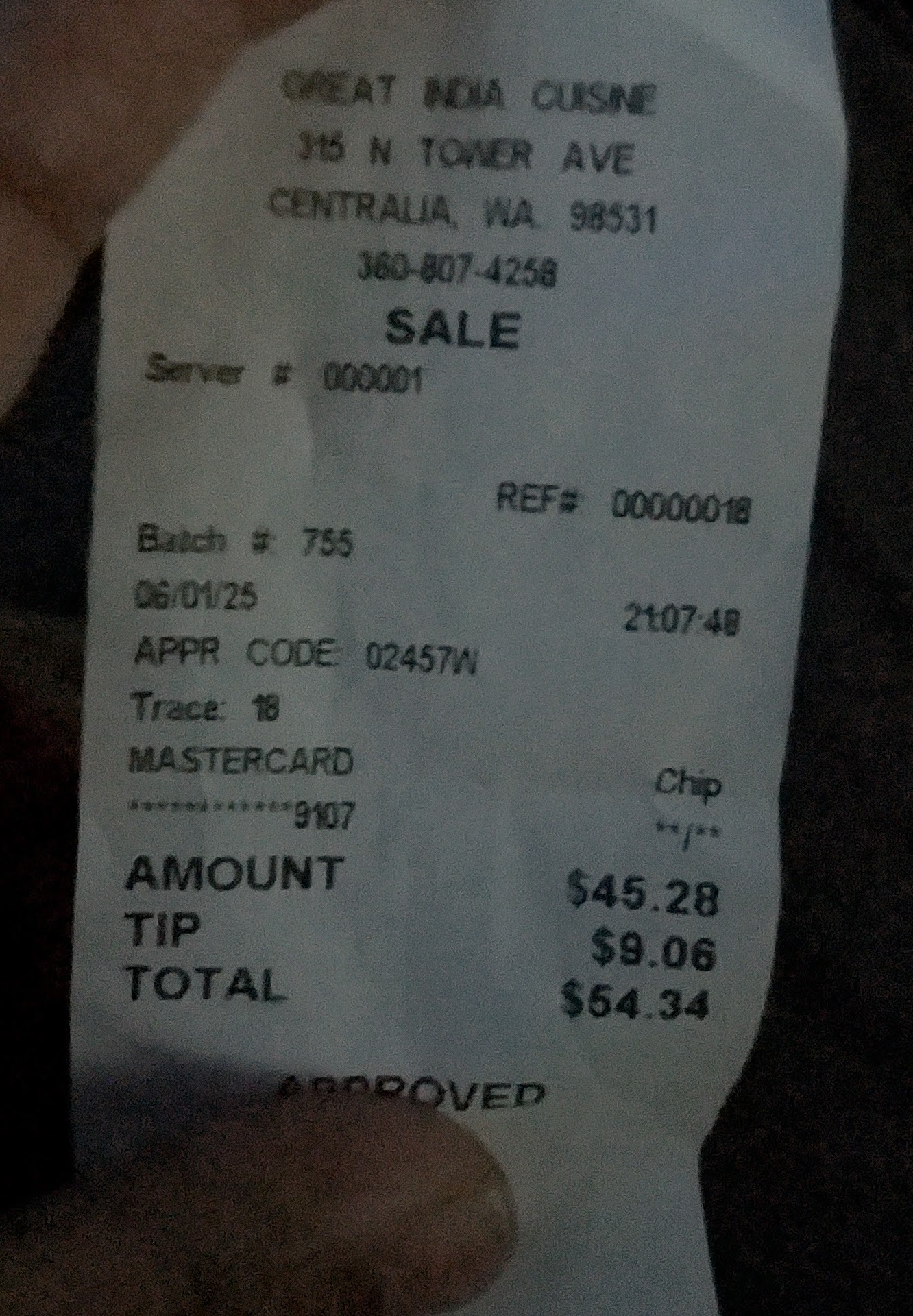 The prices are high for what it is and high for Centralia. A mandatory tip for two people is not okay, ever.