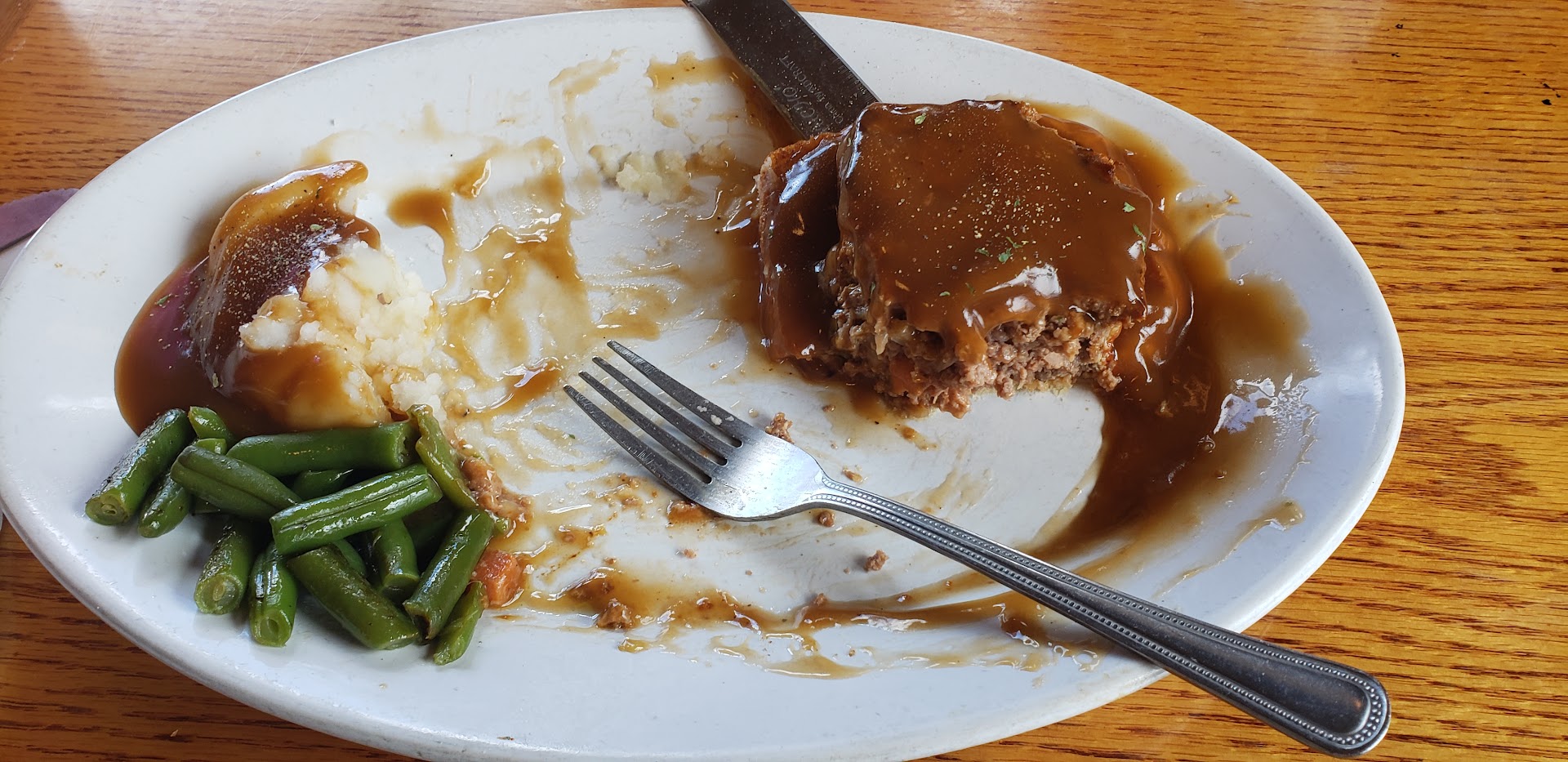 Both of my daughters got pancakes which they did not complain and gobbled it up. My ex started with the corn chowder that she really enjoyed and would be the only thing she went back for. The rest of her meal was a bland top sirloin covered with some sautéed peppers, onions and shrooms served with a mashed potato she said tasted and felt funny. When I took a scoop to taste and inspect it was mashed potatoes that was saved from a prior day and heated up poorly. It had that thick clumpy glossy look that most leftover potatoes get, I worked in enough restaurants and saved enough potatoes during my time to know how it looks and the consistency.