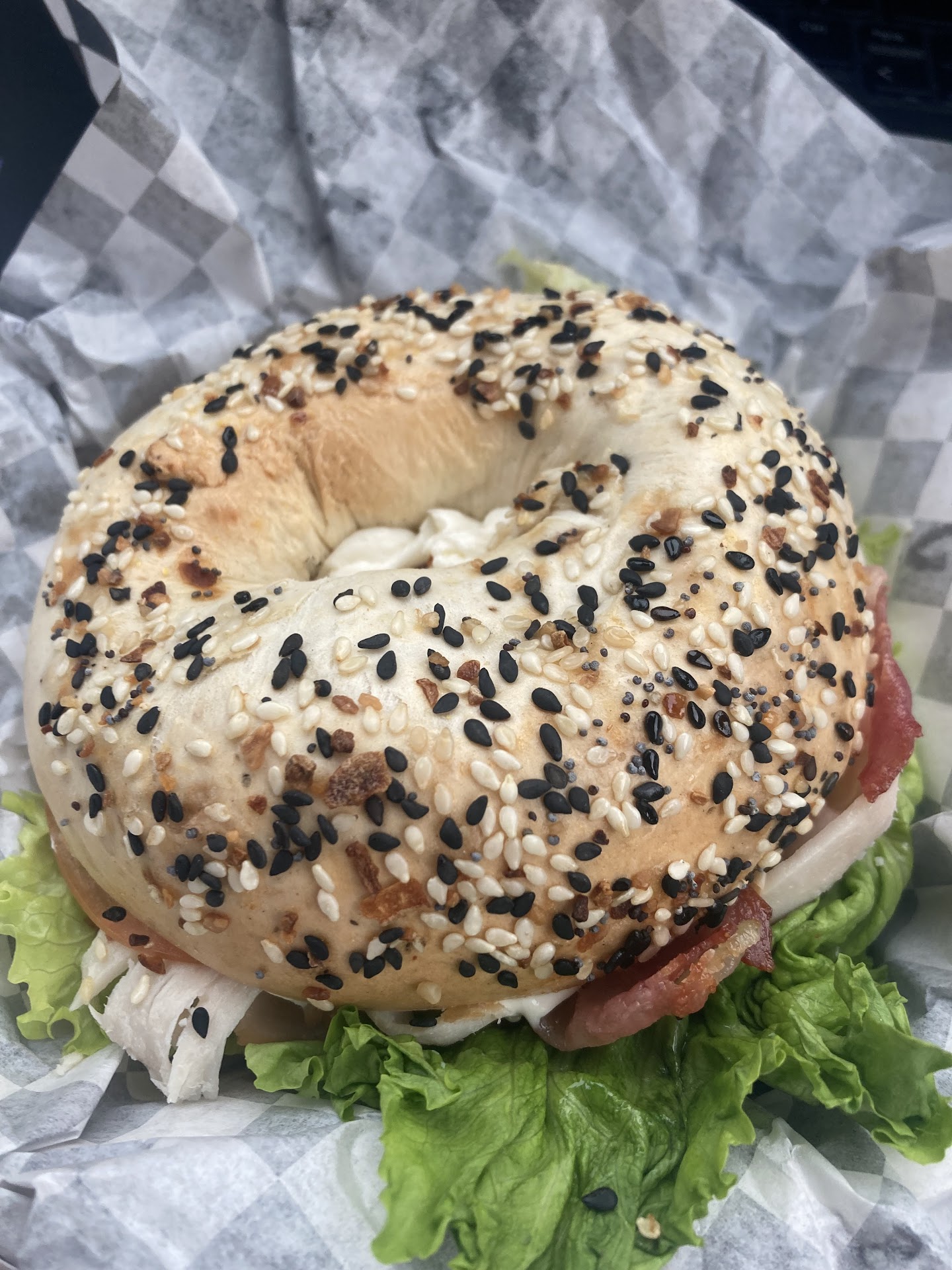 None of the bagels were fully toasted, and the breakfast sandwiches were inedible even after we heated them up. Neither had cheese, and the eggs and bacon were dry. The plain bagel did not have cream cheese on it, but a thick smear of butter and we had to throw it away. We were disappointed after spending $20 on a breakfast - which is a lot of money to throw away these days.