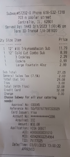 Read moreBEWARE!!! Neither locations in Centralia (poplar nor McCord) will take online codes from coupons you receive in the mail in the subway app! If you go into either store to use a physical coupon they will only let you select from a list of a few cheap subs off of a flyer they have posted when you order! They have recently only begun not honoring coupons and paying full price for a sub is not worth the value anymore. Nashville location will honor coupons and online codes through the app though! Take your business to another subway location that will...