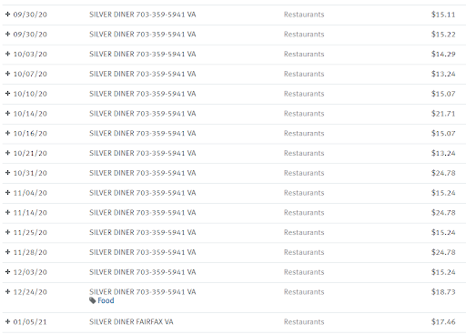 Please see all my transactions with Silver Diner in the past months. I have been a regular, loyal and tipping customer.