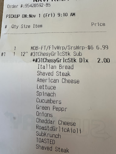 Read moreWas asked if I wanted the meal with extra meat and cheese for an extra charge I replied " NO that's ok thanks anyways" it wasnt until I got back home an looked at my receipt that's exactly what I was charged (ok my bad) which was almost $20 for a stupid sandwich. So not to mention I was never even given extra meat and cheese to be ok with it nope, to say I got what I paid for was not at all what I got! Total failure of customer service and felt and was literally robbed of a product. I unknowingly was charged after denying the extra product. Wont be going back to this store. The 2 stars was only for the food the worker was untrustworthy and didn't provide a simple task we customers have...