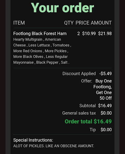 Decided to go with a footlong, with extra meat and sliced avocado, with a large drink, bag of chips and 3 cookies lol it was just under $20!