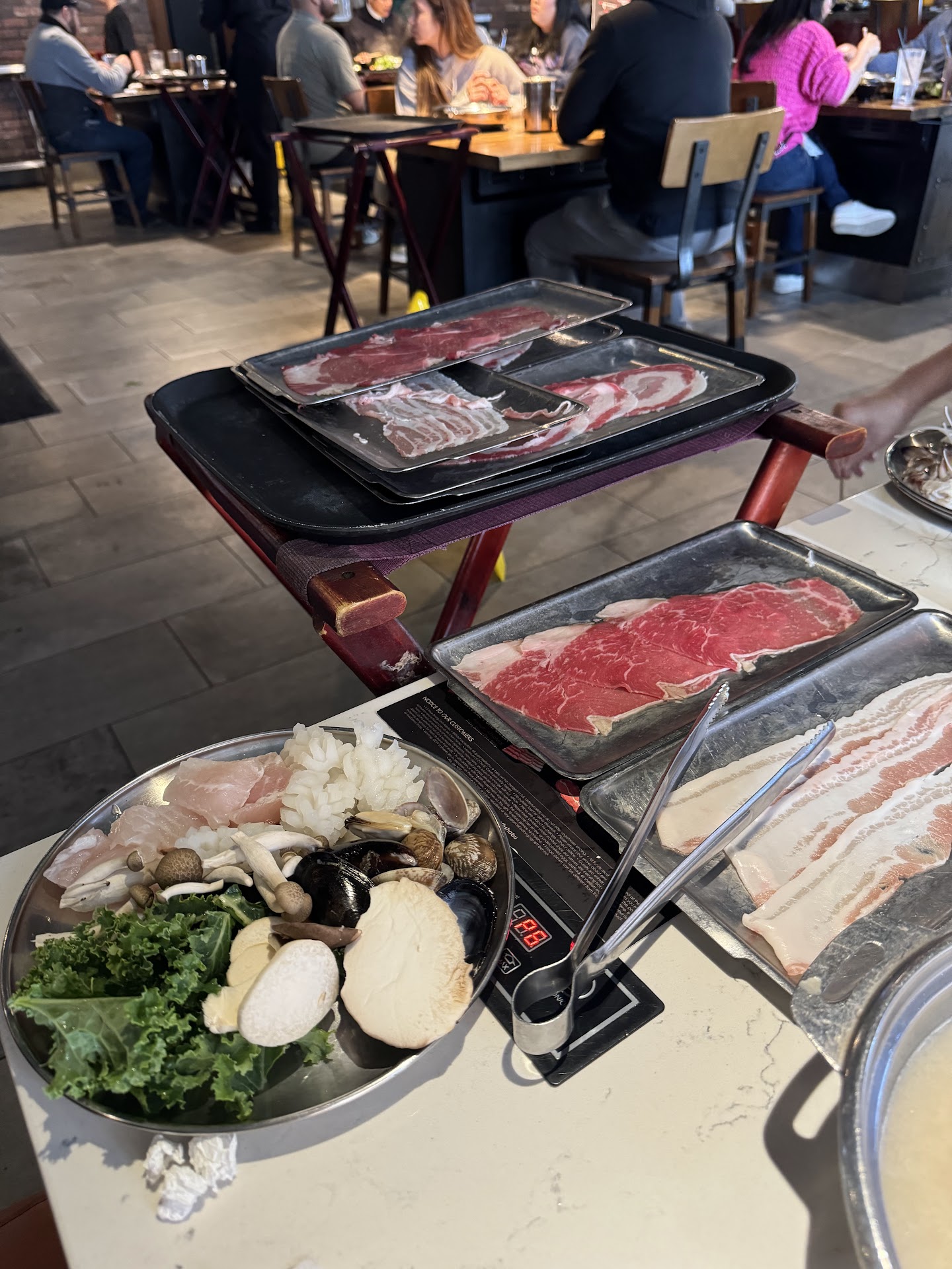 Inside, there are lots of space and seating between tables and booths. However the tables are a little cramped with the broth bowls, veggie bowls, meat, beer, appetizers and REGULAR eating bowls.