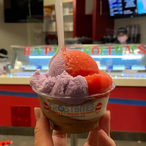 Read moreThe service is very helpful. The servers are kind and patient. They do not try to rush you even if there are customers waiting behind you. They let you try as many flavors as you want. Also, they will help you try new things by recommending what they like to have. They have a wide selection of flavors with lots of fruit flavors such as pineapple, cherry, and passion fruit to unique ones like peanut butter, taro, and horchata. I think there's something like 16 flavors maybe more. They also sell crepes here which I have heard are very tasty and are fun to customize. The main selections are just Italian ice or Italian ice with ice cream. For ice cream they have vanilla, chocolate, and combination. They also have toppings that you can add if you want them. Some popular flavor combinations that you can ask for are PB&J, Jolly Rancher, Big Stick popsicle, Pina Colada, Mounds bar and Captain Crunch. The sizes range from small all the way up to pint and quart. Perhaps the best thing about Frostbites is the reward system. You receive one punch for items over two dollars and two punches for items over four dollars. The cool thing about Frostbites is that they take into account all items you bought in your order not just your order over all like other places do. I went to Frostbites with my family and we bought four items but I got five punches instead of the one I would get at other places. Also, you earn double punches on rainy days. Therefore it is very easy to fill up your card quickly. Once you get all ten punches you are able to get two dollars off your entire purchase on your next visit. I highly recommend you go to Frostbites the next time you...