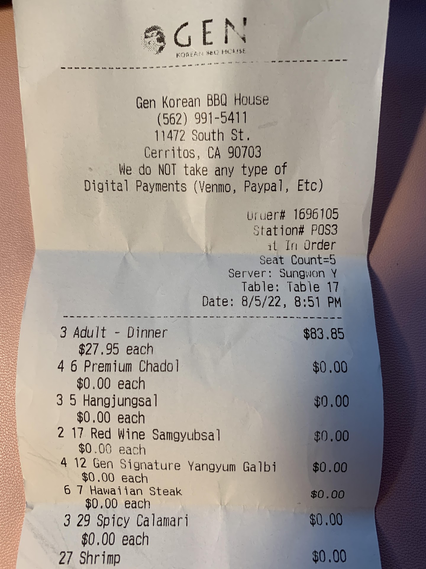 Once we sat down our server asked if we have been there before, which we have not, and just said “oh” and didn’t even ask if we wanted any drinks or food yet. He quite literally just stared with the blankest expression on his annoyed face. When our server was placing down the side dishes, a fly landed on the mashed potatoes and he looked at the fly then at me and proceeded to walk away without giving me a chance to say anything. After he came back, he just took the potatoes and never gave us a second one. When we ordered we got our drinks and rice first before looking at the menu, our drinks got there by the time our second round of meat was on the grill and our rice never arrived. The rice paper was more like rice plastic. When I took a bite out of my meat wrapped in the rice paper, I was startled since I thought the meat was the issue (it was just not for this reason) and I realized that it was impossible to chew the rice paper. It was like biting a straw. The meat quality was most definitely questionable, for the same price I could’ve gotten better meat. It was all white and a hint of pink, usually it would’ve been reddish but no. The flavor of ALL the meats are the exact same. It was as if you were expecting to drink a nice bottle of coke and all you get is water. Not even joking, I could taste the chopsticks more than the actual meat. I asked a waiter for soy sauce, since every kbbq that I went to has soy sauce, but the face of disgust this lady had, you would’ve thought I asked for the blood of her veins. Instead of politely saying they didn’t have any, she said “if you looked at the menu then you would’ve seen the sauces” and walked away without a care in the world. We had a question about what a certain meat was, and every time we tried to get anyone’s attention at that point, they all pretended like we weren’t there. There was a certain server who was standing RIGHT NEXT TO ME and I said excuse me and she stood there and then walked away. Mind you, there was 3 parties there at that point. We were there for about an hour and a half, and we only got one refill of the rice paper even though we asked and reminded our server about 3 times. Which wasn’t too bad since the rice paper was bad either way. We asked to change grills to a different server and he looked at us and said “I’m not your server” but then when the same guy came back around, what I’m assuming was their manager was near, we asked again and he did it without saying a word. We ordered Korean fried chicken to try it since it sounded good, but tell me how the hell do you overcook and undercook the chicken at the same time. Maybe it’s because the chicken was probably frozen but when I took a bite, it was dry and hard on the outside and when I took it out of my mouth it was pink in the middle. We had to put it back on the grill even thought they said it was ready to eat as served. There’s a lot of more things I would say but I don’t want to make this too long. It was a terrible experience and i strongly discouraged people from coming here. If you want better food and service go to Arisu in Buena Park. I was still kind enough to tip but damn. And the worst part of this is, I paid for this torment. If I could give this a negative number it would still be too high. Goodluck on whoever goes here without looking at the...