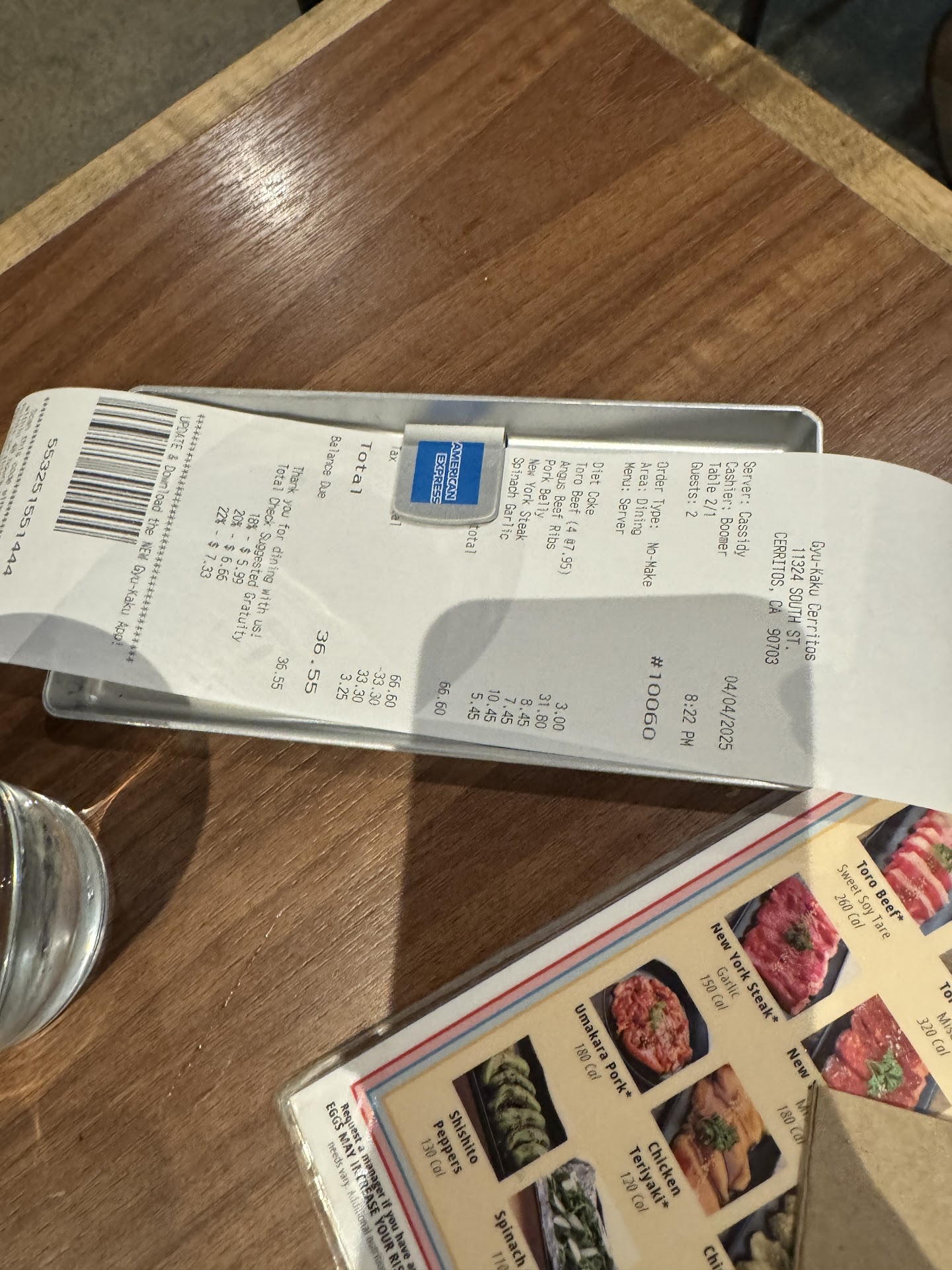 Then, without saying much else, he walked over, placed the bill down at our table, said “It’s half off,” and walked away. To be clear, we only received 2 toro beef and not 4.