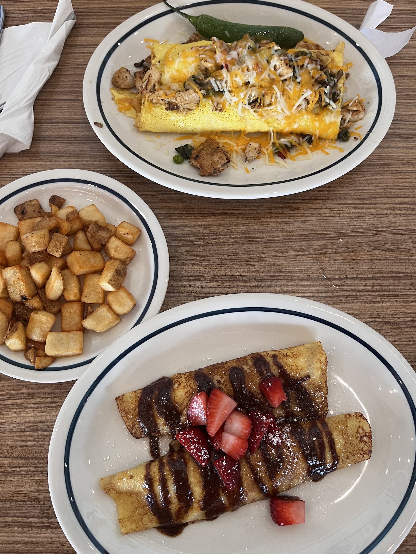 Food: The food is decent and portions are big. We got the Belgian waffles - they were way too crispy, you could hear the crunch as I bit into it. However, the flavor was nice. Other people in my party got omelets and they said it was good and well seasoned. I really enjoyed the hash browns. They were nice and crispy and had the perfect hint of flavor. The toast came out barely toasted, it just felt like raw bread.