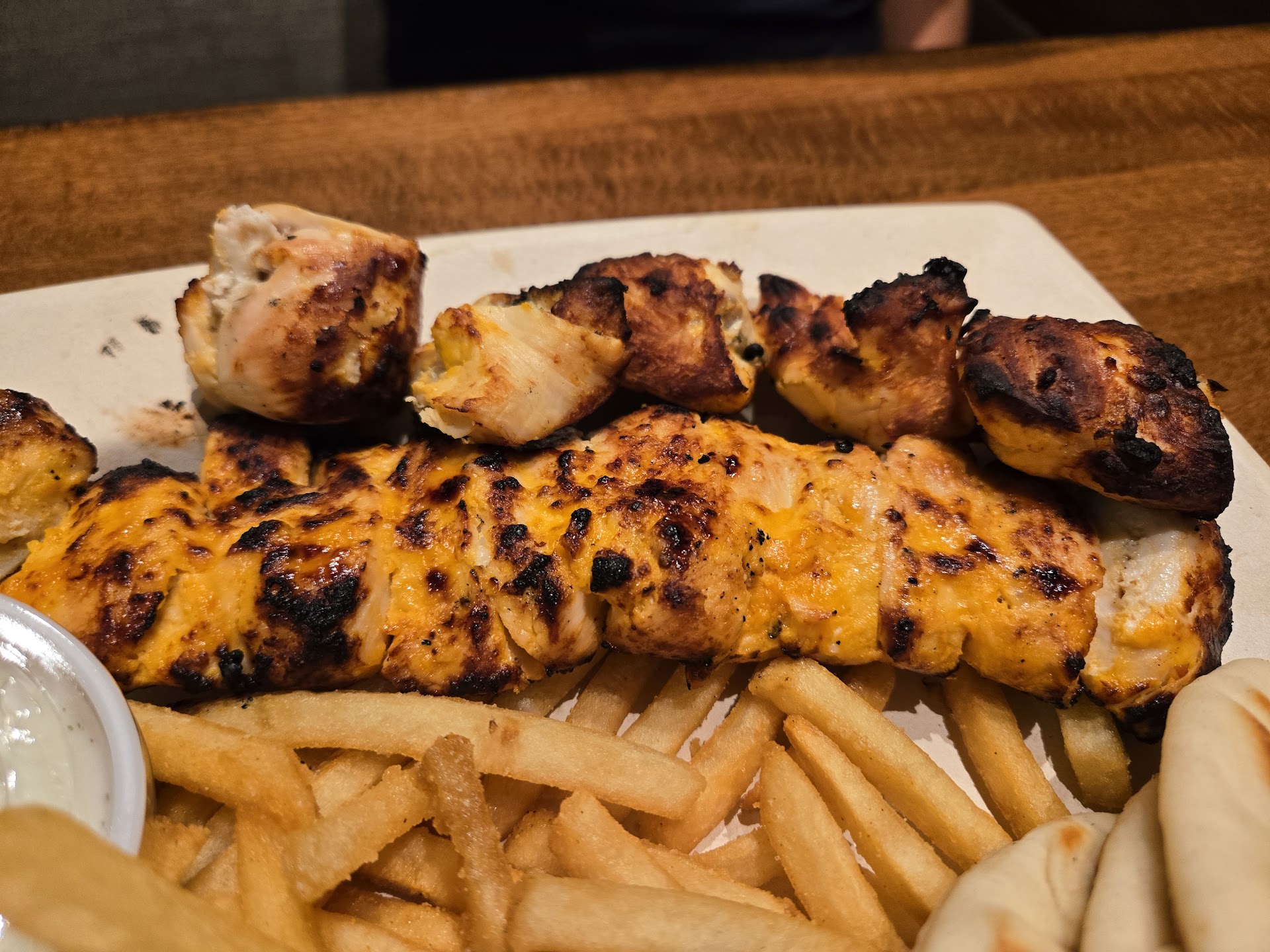 Cornish Hen on the Bone ($13.50) is marinated pieces of tender Cornish hen skewered, grilled to perfection, and served with house salad, basmati rice, pita bread, cucumber-yogurt dip, and your choice of carrots or grilled tomato garnish. It is a whole hen cut into wings, breasts, thighs, and drumsticks. The Cornish hen is quite tender and juicy. The flavor profile is similar to tandoori chicken with lemon notes and the chargrill gives it a rich smoky flavor. Rating: 4.5/5