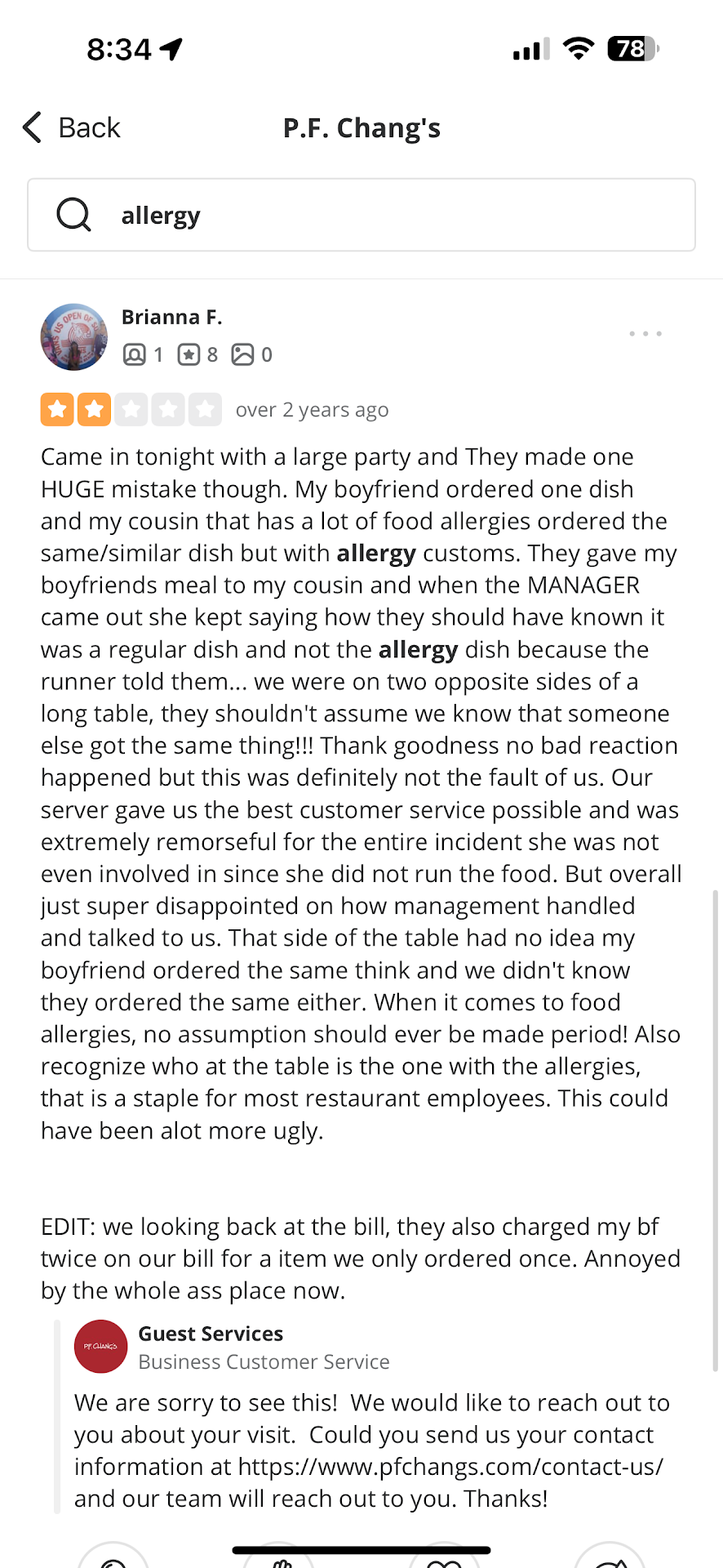 What’s worse is that this is not an isolated incident. I found a review from two years ago where another customer at this same location also had a food allergy issue that was mishandled by the manager. This shows that allergy safety is a recurring problem here, and nothing has been done to address it.