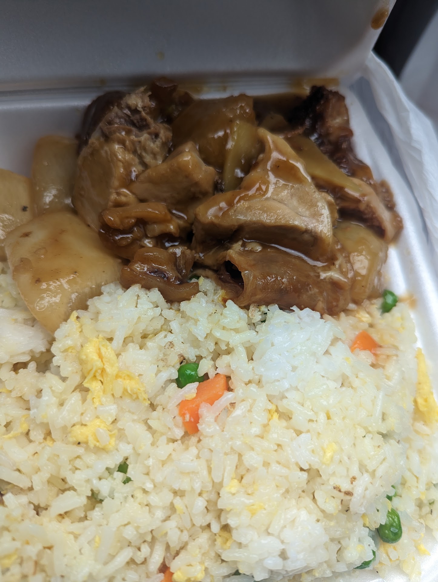 Our beef in oyster sauce over rice has crunchy snow peas, carrots & mushrooms, with tender oyster sauce dowsed beef. Fried rice can also be substituted for $1.