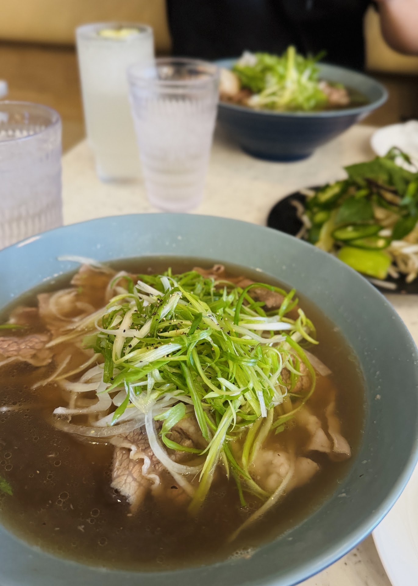 Read moreThe biggest reason for eating here is the late hours they are open. The days of really late night dinners are over for many of my neighborhood restaurants. We arrived about 8 pm and there was no waiting although the place seemed quite full. Menu is filled with these colorful well plated dishes so I was anticipating at least a semblance of said photos. Slightly to vastly different from the photos. (Is it IG vs reality photos?) I felt the food was okay but the soup lacked a distinct depth of flavor. Noodles were also still undercooked but softened eventually. I opted for the well done sliced beef brisket pho, my son opted for chicken breast pho ( sliced thinly & skinless chicken) , two more diners got the rib bone beef combo pho. Variety of milk teas : I got the jasmine milk tea and that was just the right amount of milk and sweetness. The menu says the broth is beef for almost everything or vegetable stock available if requested. Quiet overall. Server takes your credit card payment at the table. Desserts are refrigerated and individually packaged so you can even take it home. Coconut jello was good and not...