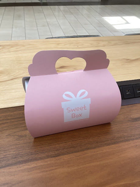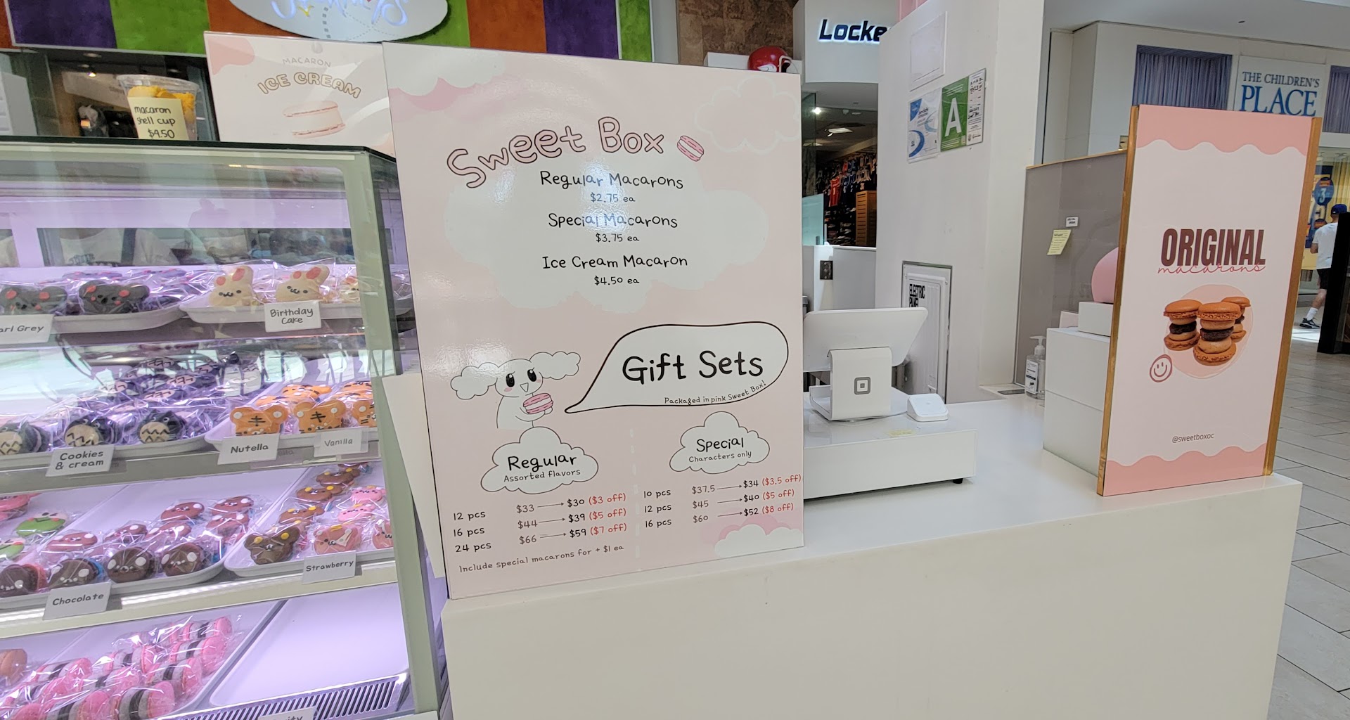 Service was good. The young woman behind the counter was busy decorating a fresh batch of macarons out of the oven, but quickly assisted me with my order. The macarons are allowed to cool, then individually wrapped, to save for later or to give away. Sweet Box is located in front of the food court at Los Cerritos Center.
