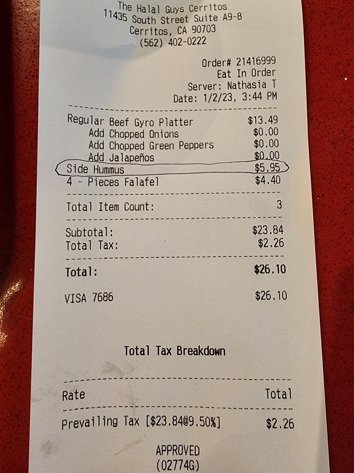 Read moreFood is not bad,nothig special,and not like the original Halal guys from NYC, but it's acceptable..Lady working at the counter was nice,polite,and the place was clean..I usually don't give one star reviews often, when i am not satisfied, just don't even leave the review, but this place really crossed the line..I used to eat a lot of Halal guys back in the days i used to live in NYC, where this was once affordable street food,nothing like this fancy franchise BS,expensive as hell..The price of a platter is a way too high, for the amount and the quality of food you're getting. Ok,i can understand, but the side portion of hummus is outrageous..Such a robbery..The cup on the photo wasn't even a quarter full,literally one scoop of the hummus inside, and the price was 5.95$..Absolutely ridiculous price.. Falafel costs more than one dollar a piece..I would say probably the most expensive falafel in USA, and not even close to the quality of falafel elsewhere.. Not to mention that the large platter i took,was almost half empty.. They should name it as a MICRO platter..I spent 26.10$,and i literally left the place hungry.. Place is such an armed robbery..😌 Actually, i was waiting for them to start charging me for the air i was breathing inside,as i was dining in.. Franchise Halal guys, never again, it's actually the biggest scam among the street food franchises.. Typical place, which from the great food truck,went downhill big time.. Such a poor business strategy with a greedy owners,offering you the plates which keep getting smaller every time you come, but with a hefty price tag.. This has nothing to do with the original Halal guys.Unfortunately all the franchises HG have the similar issue, absolutely overpriced and lack of quality..Not to mention the size of the...