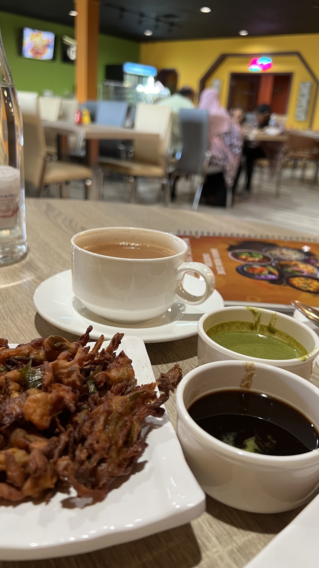 The atmosphere was pleasant with Bollywood videos on many different TVs, not too loud, just interesting and entertaining. The tables and floors were clean. The decor was tasteful and simplistic, which is appealing when you have intricate food. However, there were a lot of flies in the dining area, totally disgusting. This problem needs to be addressed somehow because it makes people lose their appetite.