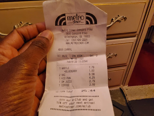 Read moreHello Google Family. My beautiful sister friend, Wanda, and I visited The Metro Diner for our monthly ministry fellowship breakfast in Wilmington, De. There are many Metro Diners locations. There is one in Bensalem, Langhorne, Newark, DE, Middletown, DE, North Wales, PA and Pottstown, PA. Wanda ordered a Waffle with blueberries, I had silver dollar pancakes with scrapple. Check out the photos to see the prices of everything. The food and fellowship was outstanding. Our server, Darryl, was wonderful. On the ball, always going above and beyond. Darryl or D, as he is called here, was accommodating to our every need. A phenomenal server, Darryl is. D should receive a bonus on his next payday. I gave Darryl my business card and asked him to follow me on Facebook and Instagram. D told Wanda and me about the Fetch app, which is an app that rewards a person who collects receipts and they can receive rewards like gift cards. We visited the restroom. Nice and clean. The restaurant was crowded when we arrived on this Saturday, February 19th. And when we left, it was still people waiting to be served. Get on the wait-list, we did and we were served as soon as we arrived. I will definitely return. Wanda and I explored Concord Mall when we finished our meal. Darryl had told us about a logo place in the mall, that I wanted to check out since I have a brand, Krystique. Our visit at The Metro Diner in Wilmington was a delightful experience and we will return soon. Also the young lady who told us about the Fetch app was a delight as well as the young man...