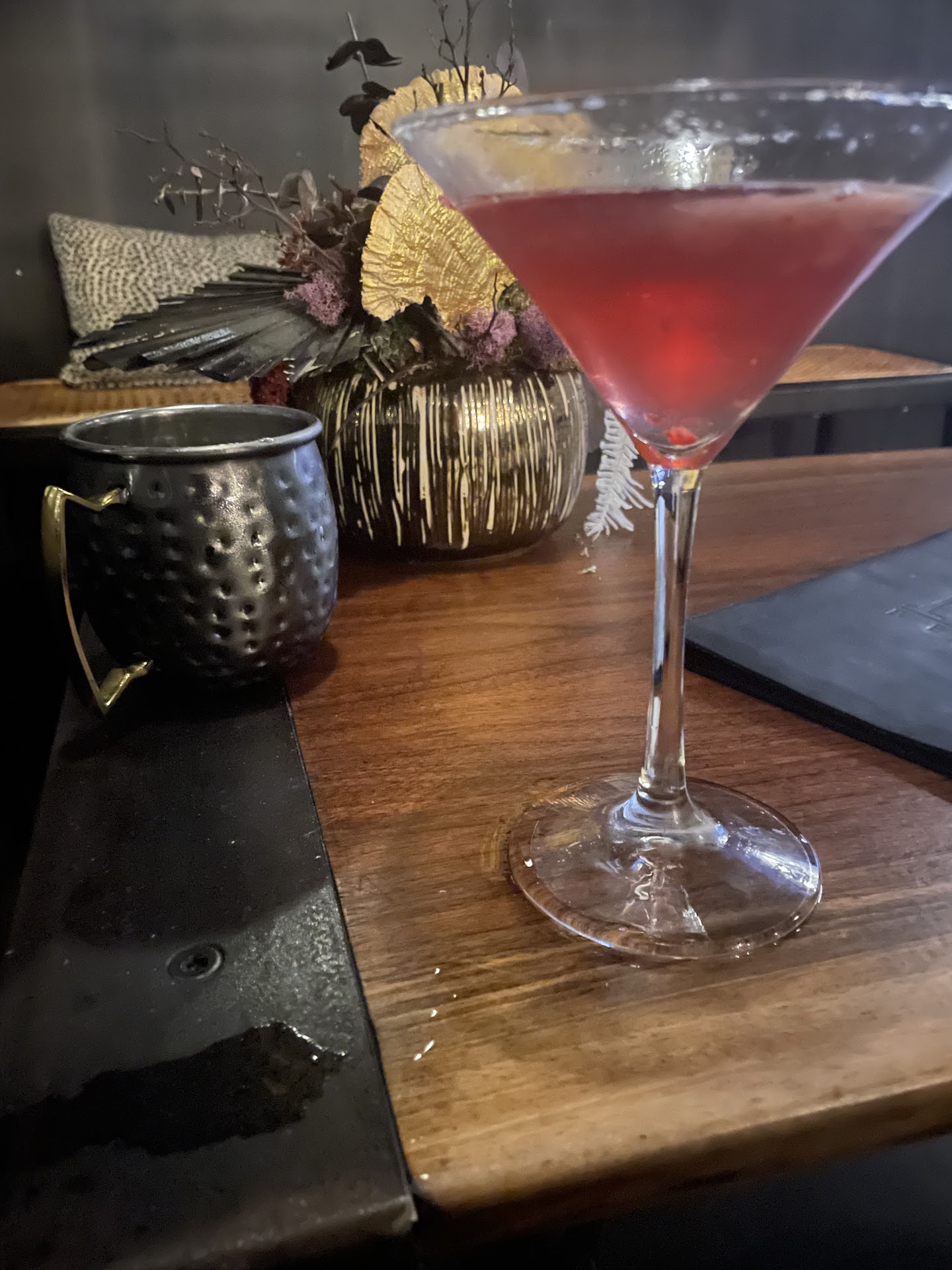 M Bevy is a cute and intimate place complete with modern decor, a center island bar, high tables, and couch/chair seating. The drinks are good and moderately priced. The atmosphere is relaxing with dim lighting (perfect for a date night). My fiancée and I visited on a Friday night after dinner to have a cocktail, it was fabulous. The service was quick and pleasant, he gave us suggestions on the drinks which were on target. I had the Moscow martini in a cooper martini glass (a 1st for me and I have had a lot of Moscow mules). The Moscow mule was perfect and seemed to have a great volume of contents in the glass. My fiancée had the Black and Blue which was recommended by our server; he loved it. It was on the sweeter side but very delicious and had great presentation. There was a pool table and intimate seating area by the fire place in the back and would be great for a double date or a small group of friends grabbing a drink. The only reason I gave it 4 stars is because every time someone would come in or leave out of the front door it would stay cracked and the cold air would come in. My fiancée and some other people repeatedly kept going over to shut the door due to the cold weather. This wouldn’t have been a problem if it were warm outside but it wasn’t so it was quite annoying. Other than that, this place is definitely...