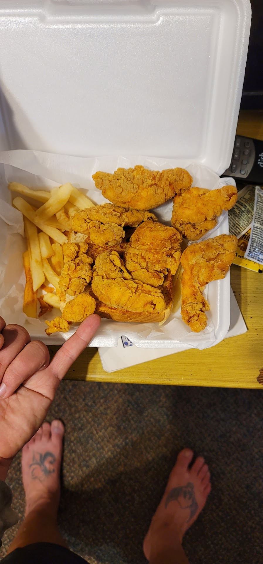 So in the picture I have four o eight tenders on the slice of regular bread served with the tender basket with the other four tenders touching the bread and fries.... two of the tenders are legitimately the size of the top of my little finger. .... so wouldn't not recommend the tender basket other than for an infant.