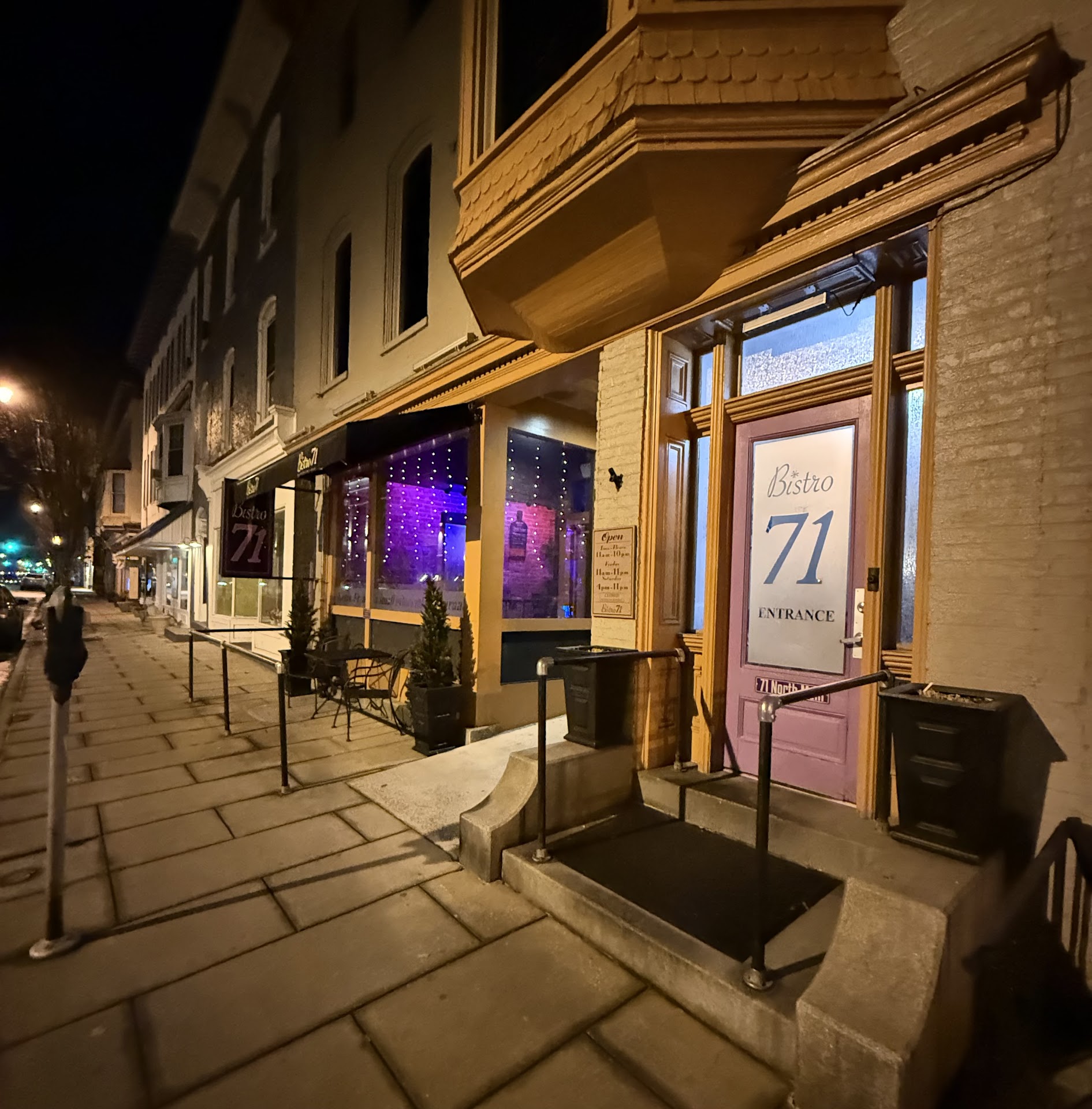 This was my first time visiting Bistro 71, and the food was exceptional, overall. We started with the meatball appetizer, which was delicious. No complaints, and would definitely order again. Next, we got our soups. I got the tomato bisque, and my roommate got the French onion soup. Our server told us they were working on a salmon potato soup (their soup du jour/of the day), which sounded amazing, but it wasnât ready (at 6PM). No problem. After that, our house salads and dinner bread came out. Sooooo good! One of the best salads Iâve ever had! The bread was good, but nothing to write home about. Then came the entrees. I got the filet, ordered medium rare, with fingerling potatoes and a brussel sprout salad. My roommate got the crab cakes. Although my filet came out medium well/well (not even close to medium rare), the butter compote helped make it one of the best filets (flavor wise) Iâve ever had. Had it not been topped with the compote, and seasoned/seared so perfectly, I wouldâve for sure sent it back, because it was basically well done, to the point that I struggled to cut it. It wasnât tough to eat, but definitely wasnât juicy at all, which I prefer. There was no pink or red at all, other than in the very center, and even there, it was minimal. Honestly, if it wasnât for the delay between each dish and drink refill, I wouldâve asked for a remake. My roommate wasnât a big fan of the crab cake entree, but asked if I wanted to try it, and I really liked it. It was extremely flavorful, which I loved, but he didnât because he felt it took away from the crab flavor. We ended up getting desserts - him the cookie with ice cream, and me the waffle with ice cream. Both were phenomenal. Personally, Iâd love to come back. Other than my filet being seriously overcooked (which shouldnât happen when you pay $42 for a filet), I really enjoyed the food, and my roommate would probably just order something else. He said himself that he could understand why some people love the crab cake entree, but he personally prefers less âadditivesâ to preserve the crab flavor. I disagree, because it added a ton of flavor and tasted amazing to me. I told him it was one of the best crab cakes Iâve ever had. My only personal complaint is that my steak was wayyyy overcooked, or maybe sat under a heat lamp for too long after it was cooked medium rare. Anyway, we still tipped 20%+ âcause our server had to walk up and down a rather narrow set of stairs and was generally good. He even boxed the food up for us. I would recommend this restaurant! Iâm rating it 5 stars because Iâm a server and understand that every restaurant has off nights. Just hoping itâll be worth the 5 stars the next...