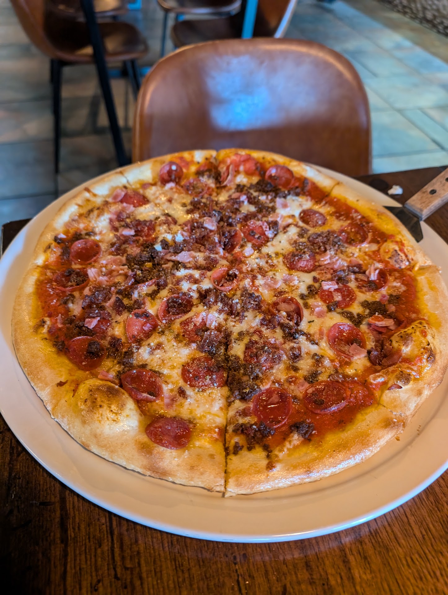Pizza is handmade and cooked in the fire oven. Again, done very well. The dough is the right thickness, when you bite into the pizza, you don't feel like you are eating nothing but the dough.