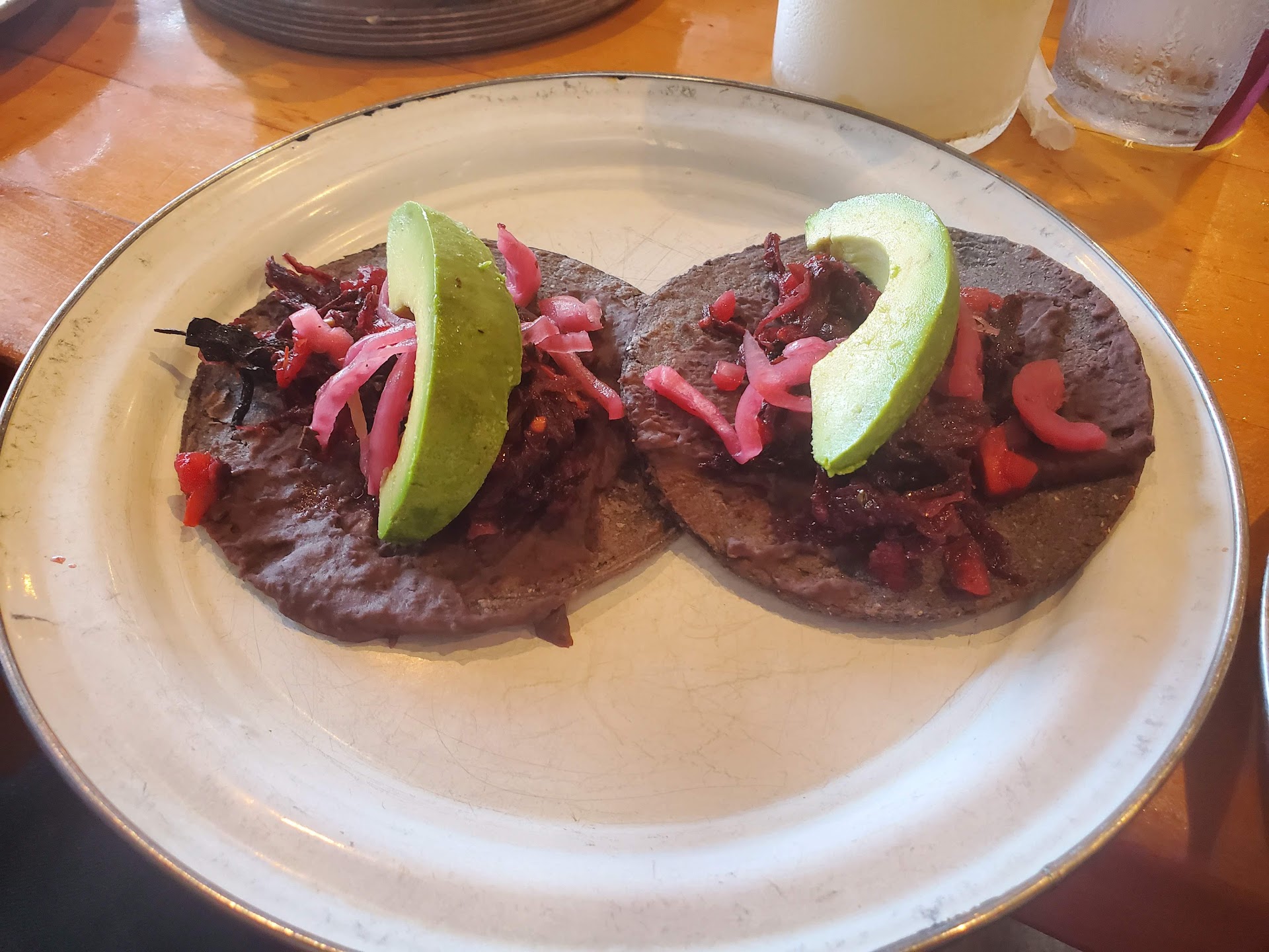 Hibiscus Tacos Fried hibiscus flower, refried beans, avocado, pickled veggies ❤️❤️❤️❤️ This was good we figured out another veggie we like. #veggietacos