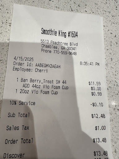 Read moreThis was by far my worst experience with Smoothie King. I have been to various SM across the country and have been going to them since 2011 (when they offered punch cards) and on this particular day I received the worst possible service. Upon entering the store, the tenant did not greet us or acknowledge our presence. We walked to the counter and looked at the menu for at least a minute before politely saying hello gain some type of recognition from her. In an unpolished manner she said, "I will be with y'all afterwhile." We stood there a little while longer before she said, "I'm guessing y'all are paying with cash or card since y'all are standing at the register." This made us feel even more unwelcomed, but we replied yes. She then came over to take our order but cut my companion off when she asked a question about a particular menu item in a "you should already know this or why are you asking me type of manner". Once she finished taking our order, a separate customer walked into the store to which she greeted him with the upmost of pleasantries and warmth... unlike us. She gave him his order and even gave him well wishes with the rest of his day. As she completed our order, she placed our order in the cupholders and said nothing else. Not even that they were ready. The overall rudeness and attitude of this server has turned me off from wanting to revisit this store. There are only two smoothie places within this area, and I am highly disappointed in this level of service from...