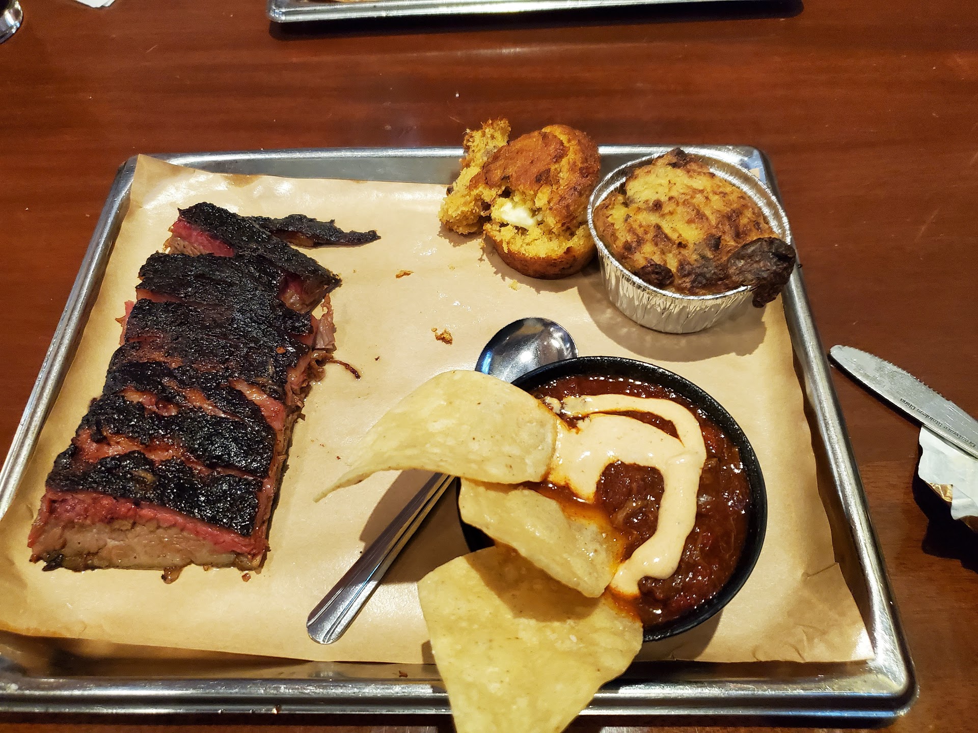 Read moreMy partner and I came for lunch this past Friday. We got right in and loved the vibe of the place. We looked at the appetizers and none jumped out to us so we skipped getting any. I ordered the brisket sandwich with both the twice baked potato casserole and the Mac n cheese. My partner ordered the beef ribs with a side of their brisket chilli. Looking around it was clear this place is very popular at lunch time and everyone looked to be enjoying their food. We, however were let down by the food. After one bite of my sandwich, it was clear that it was far too over cooked and dry to eat as a sandwich. The flavor was good, it just was very dry that it was hard to swallow so I ate the 4 pieces of sliced brisket on their own. The Mac n. Cheese is the same Mac n cheese that you will get from any buffet, bland and mushy. The twiced baked potato casserole tasted premade/outsourced and just reheated. Nothing to rave about. The brisket chili tasted more like a mix between onion soup (there was a TON of onion in it) and some chili. My partners beef ribs looked good, and when tasting it they were moist but the smoke on it was very strong. I personally would not have been able to eat them. Overall the atmosphere is great, the waitstaff was fantastic the food was a let down. I think we just ordered the wrong items to try. Or it was an off day. We were not impressed with our...