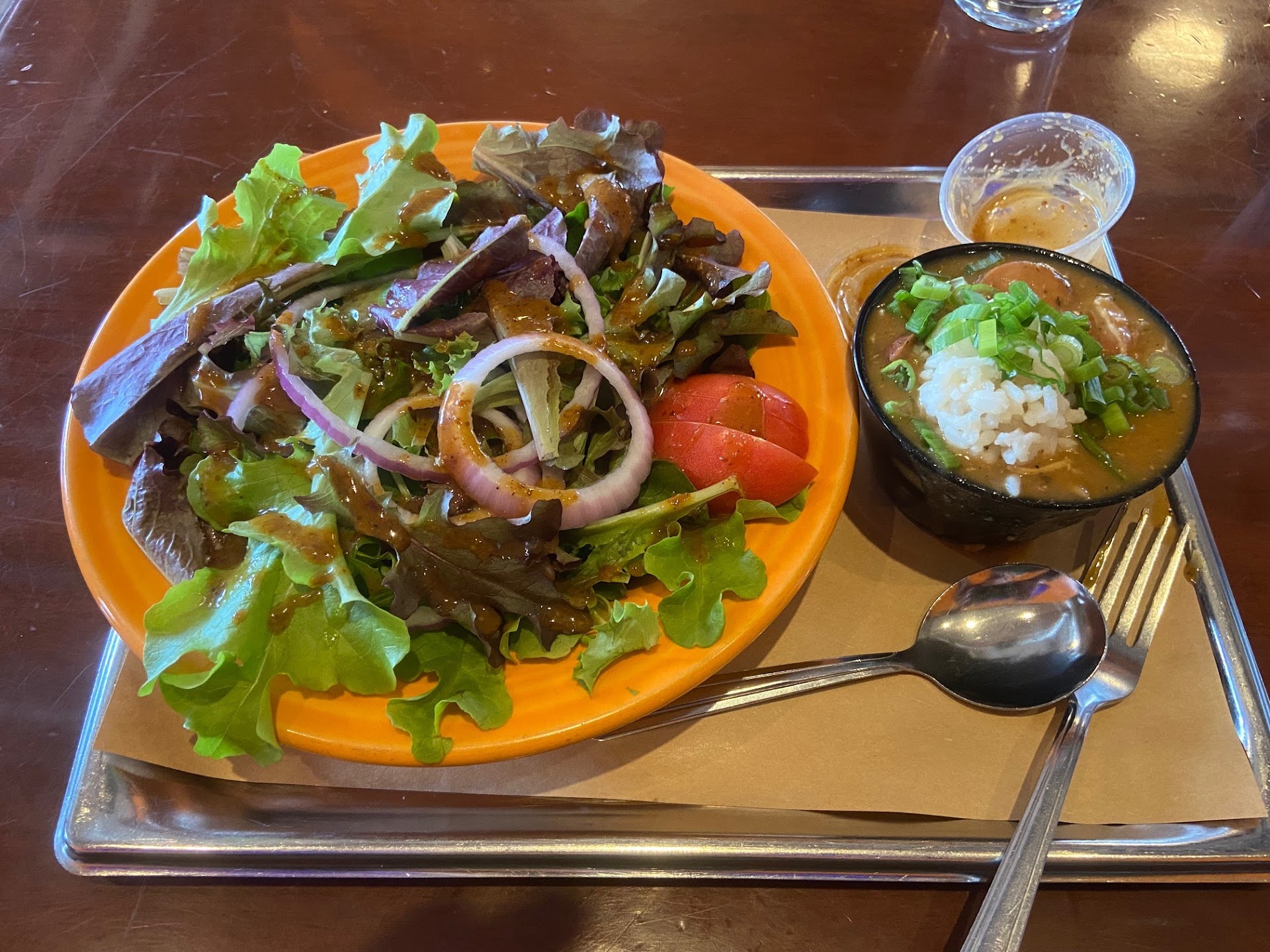 For appetizers, I ordered a garden salad with a tasty creole vinaigrette dressing, and also the daily special of smoked chicken and andouille sausage gumbo, which was served hot and had a nice heat kick. The andouille sausage was little bland, but it was still a decent gumbo.