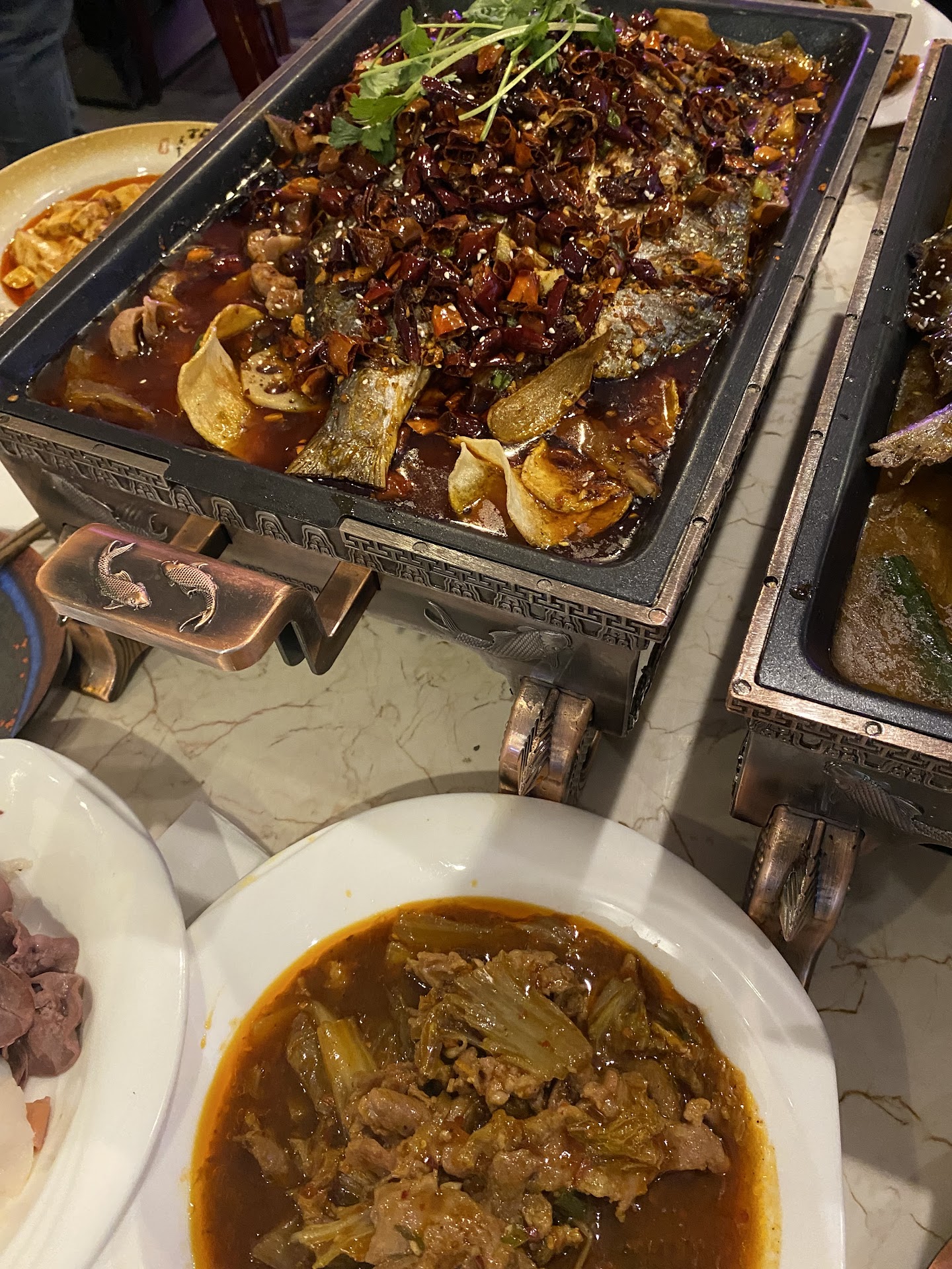 We decided to come here on a snowy afternoon a little after lunch hour figuring with the title of the restaurant, it had to be good for grilled fish. The menu revolved around their fish specials which I found kind of high. We ordered the sea bass with chopped pepper. When the fish came out, I was throughly impressed since it had a good amount of spices and the presentation was majestic and you felt like royalty sitting waiting to be served. The service was quick, staff were courteous and the fish had burners on the bottom keeping the broth nice and hot. The presentation alone was worthy of the price point. I was amazed when the owner told me that they do not use any MSG and everything is prepared fresh every day. I recommend this place to everyone whether you prefer spicy food or not. The other hot dishes such as chicken and mushrooms are also tasty. I will definitely...