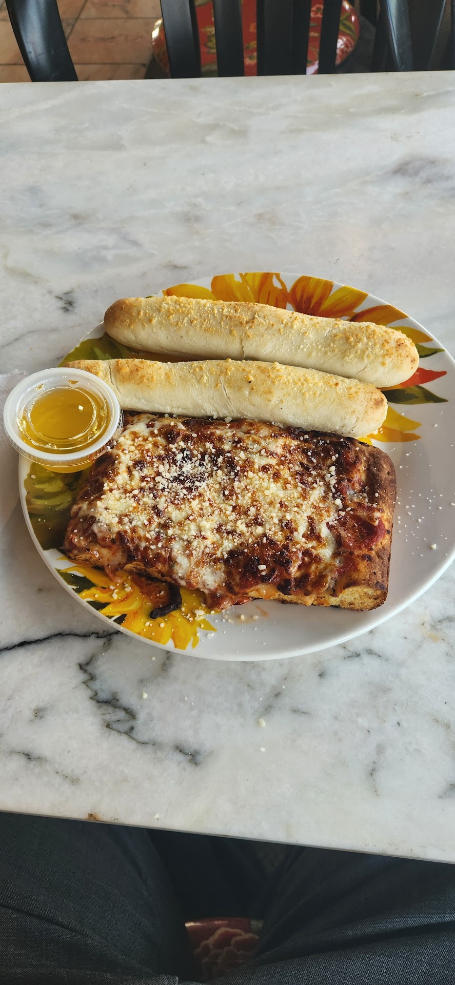I always start with the cheese slice at a new pizza spot, so I got the cheese combo meal. I was excited about this place because they advertise as pan pizza focused. Garbage. Utter garbage food. The first red flag - food related at least - was when I saw them remove a premade rectangular slice. It looked frozen but I thought, “ eh let’s give em the benefit of the doubt. Perhaps it’s just premade slices that are refrigerated.” Perhaps it was refrigerated and not frozen but it sure tasted like they were frozen. This tasted on par with little Caesar’s pizza meal deals. Difference being that little Caesar has tasty breadsticks.