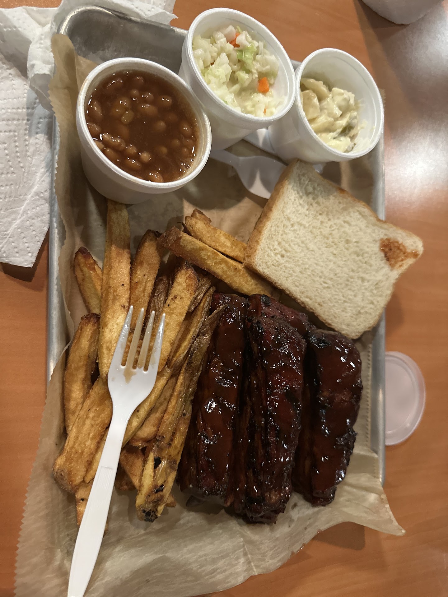 First time getting food from them and let me start by saying that the young lady working the counter was OUTSTANDING ... A warm welcome and a big smile ... Most times when you walk in most places mid day , it was like 3pm , you get a lack luster greeting ... Took a few ticks to get my order but no biggie ... The Rib Tips were nice and meaty and the sauce was real good ... The fries were pretty good , could have used a few more , and the baked beans were good but who doesn't put hamburger in their baked beans 🤔 ... Couldn't comment on the slaw cause not a slaw kind of guy ... Will definitely be back because been looking for a good BBQ place here ( and no lil Porky's , Wood n Hog and Black Dog aren't it ) and this might be it ( I'm a Big Johns BBQ in Peoria and a Thelma's in Houston guy , if you know you know , so ) ... As you see I gave the food and atmosphere 4 stars but the place gets an overall 5 stars solely for the friendliness of the young lady at the...