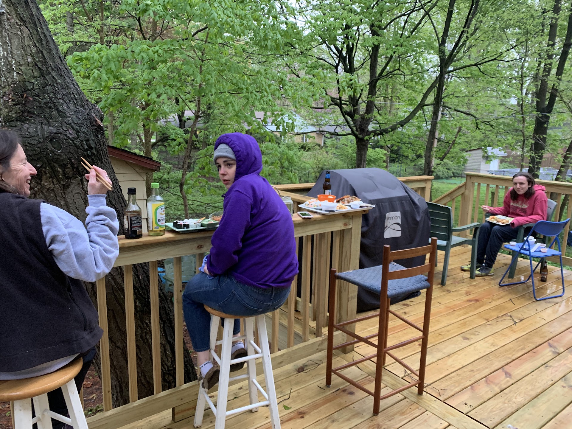 Iāve never had a bad meal at Sushi Kame, and that didnāt change when I brought it home to celebrate the end of the semester (for anyone reading this next year or next decade, recall that Spring 2020 was not a time when we went out to eat). Picture of us eating on the back porch attached, so my brother who lives elsewhere could eat with us. (It was not warm out but the food was still excellent!!)