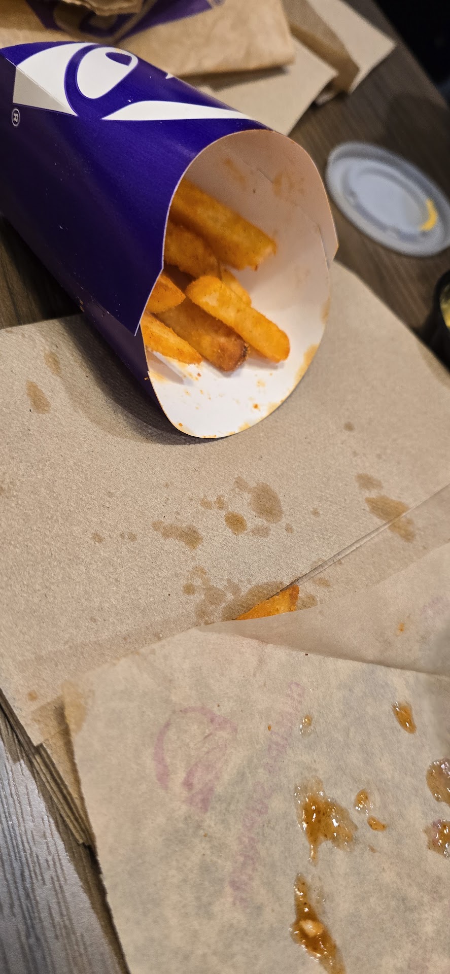 Read moreOrdered the new steak chalupas box that includes 2 steak chalupas, 5layer burrito, soft taco and twists, but swap twists for chips and upgraded to beef taco supreme. This was a pickup in store and eat in. Got regular soft taco, so had to go up and have it replaced, though it was good. 5 layer burrito tasted great but seems smaller than previous as it was only 2 sauce packets long. The chalupas are not standard size but half the size of regular ones. Though meat tasted good, the the deep fried cheese chalupa breading was tough and rubbery to bite into and eat. I'm NOT a fan. Had to try it however, as it looked good in ads I got. Customer service seemed pleasant. Place was very clean inside, like no one has been in there. Urinal was backed up and wouldn't flush previous use (no pic attached for that). The surfaces definitely had not been wiped down recently as you could see fingerprints and grease on them (toilet handle, door handle, and...