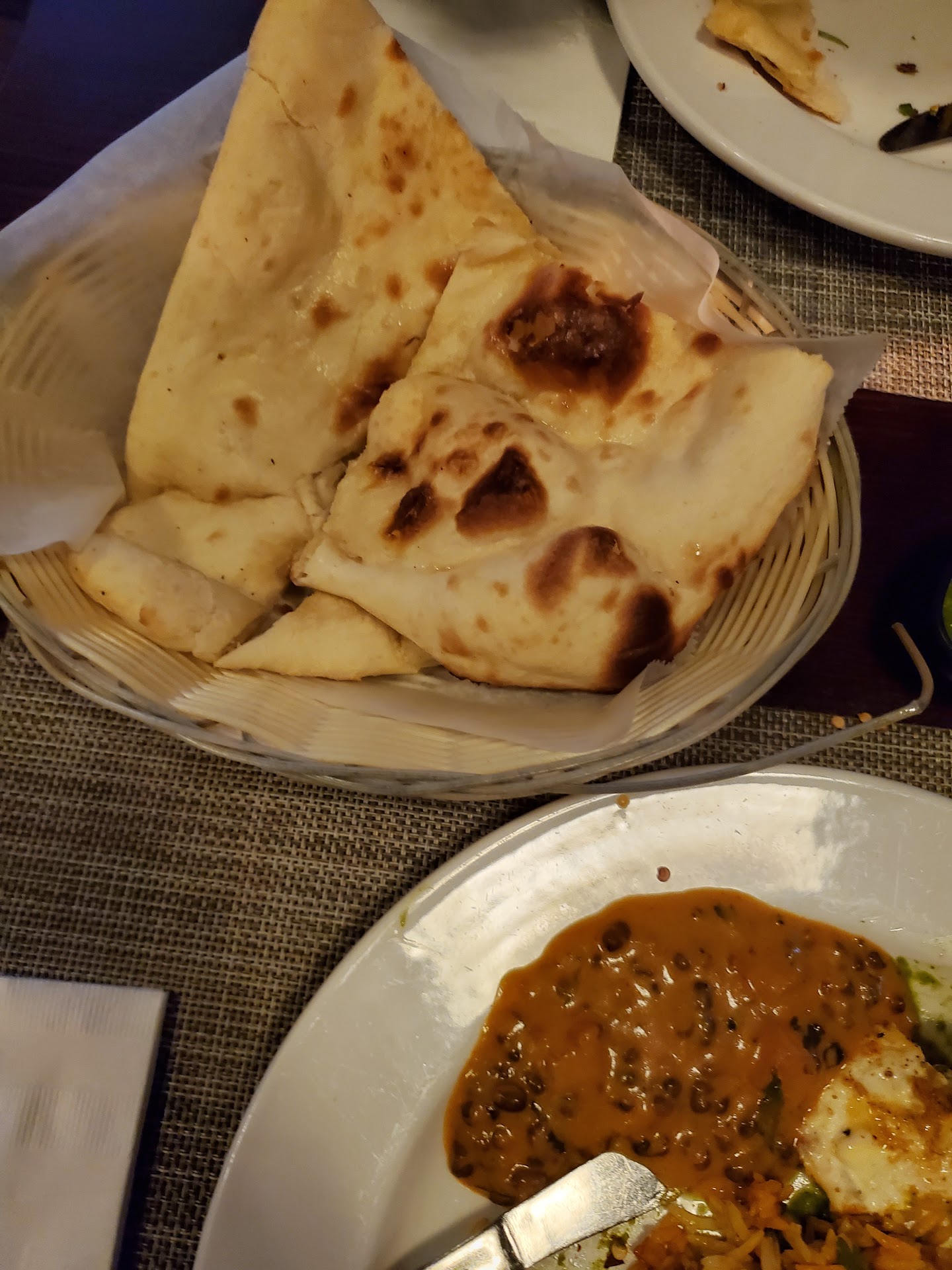 FOOD: It was my first time trying indian food and ordered Goat Curry. The goat has bones. The flavor just burst into my mouth. The Naan bread was freshly made - crunchy and soft at the same time. I dip it on my curry and put some of the goat in there. I was surprised how big the portion was, too. I also ordered the Indian mule. The drink didn't taste any different than regular mule. I wouldn't order it again.