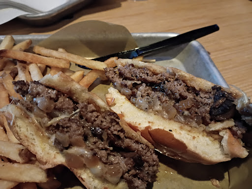 I also had ordered garlic fries with my burger as an add-on (on the menu) but the server brought me regular fries instead with my burger. He apologized, and said "keep the regular fries" and brought the garlic fries in a small basket after a short wait. I really would have preferred a discount here - I am not interested in keeping the WRONG order of fries as a makeup for the error. He didn't give me the option for that, nor do I suspect would that have been possible. If anything, the burger was decent.