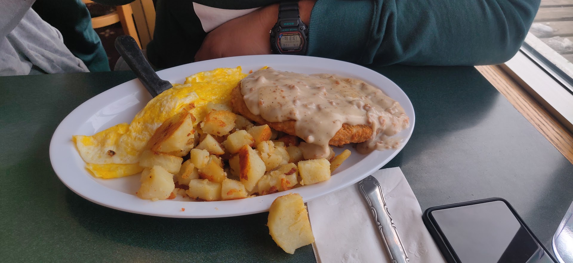 Decided to try out a local diner, and found this place. Took my family, and got to enjoy a good breakfast! I would say this is a solid mid-level breakfast spot. If you're looking for super fancy attention to menu details, or homemade specialty items or dressings, this is not THAT place. If you just want a good cup of coffee and a tasty meal that's not gonna break your pockets, they got you. I ordered the Grilled Chicken Bacon Apple Fritter Sandwich(which is exactly what it sounds like chicken, bacon, and cheese between two slices of a fried apple fritter), my family ordered the chicken fried steak, and also the two and two breakfast, and a cinnamon roll. I got coffee as well. The coffee was decent, not the strongest, but not super weak. It was a little bit of a wait between ordering our food, and getting everything; however, I noticed that most of our wait staff was older folk. I don't know if that's always the case, but noticing that, I decided to be very patient. (And if that is the usual staff, and you complain about the delay, shame on you. Respect your elders.)The food was delicious! I was a little leery of the apple fritter sandwich, but it was crispy and bacon cheesy with just a touch of sweet from the fritter bread! Really effin good, and I highly recommend trying it if you like sweet hot crispy flavor! The regular breakfast items were well done and pretty standard, bacon, eggs, etc. Nothing exceptional, but nothing terrible. The country fried steak was crispy and good, and covered in a good amount of gravy. We had American fries (the chunky fried potato bites type), and they could have been a lil bit crispier, but they were cooked well and yummy. Oh, yeah, we had french toast too, and that was buttered and syrupy and good too! Nothing exceptional (like compote, or homemade syrup, or anything like that) but a solid good french toast! Overall, I feel like this was a decent local breakfast joint with solid food. The prices weren't crazy, and the food was decent. The staff was nice enough, and the place was Minnesotan Cabin style decor(Cabin-chic, if you will), and clean. If you want a good mid level breakfast experience, I recommend it! I have plans to go back and try the Bagel Burger, and perhaps the bacon and cream cheese...