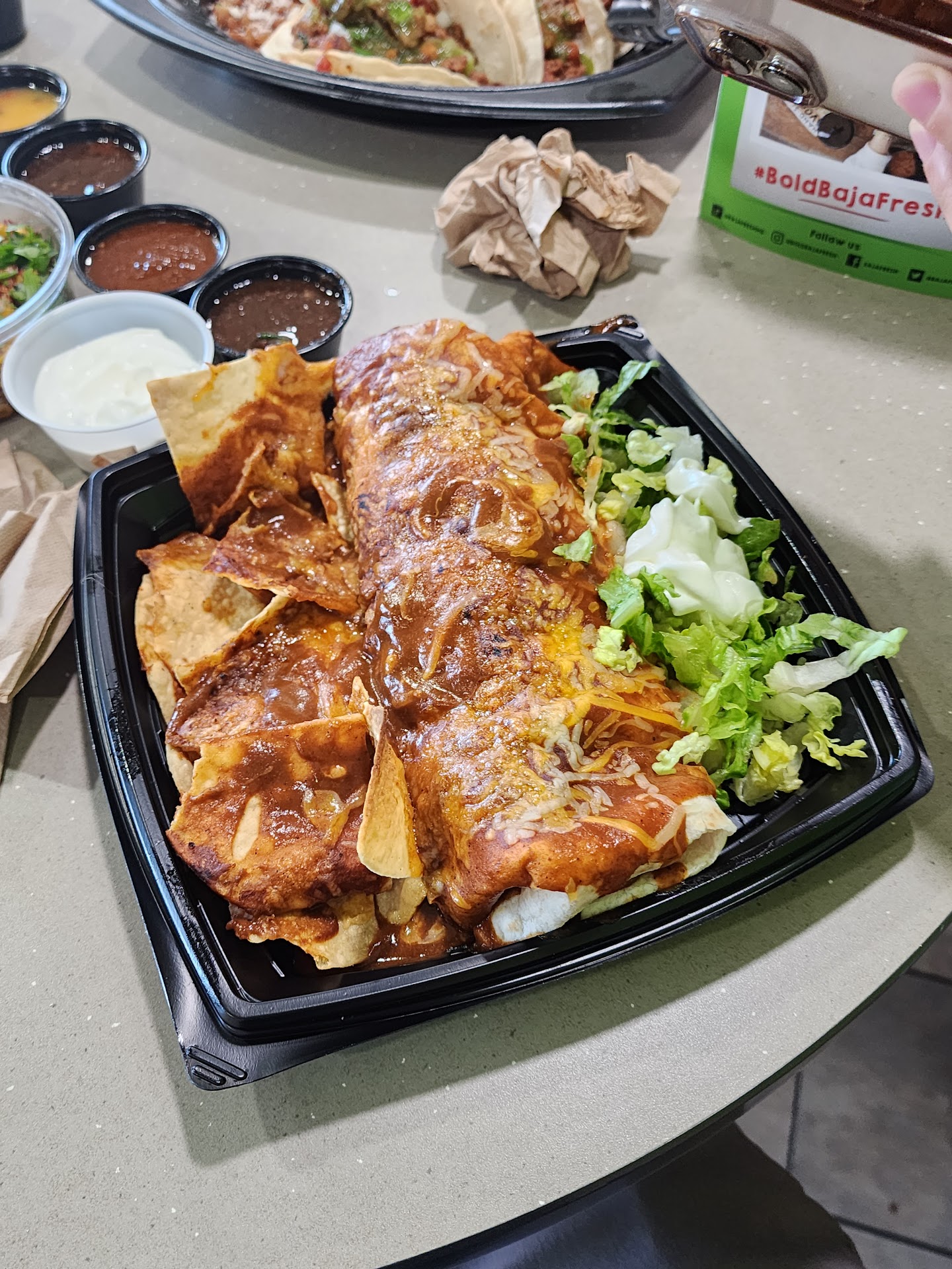 Ā Ā Ā Read moreBaja Fresh was fantastic! It's been a long time coming, but worth the wait! I went in for take-out. The food is cooked to order so it tasted very good. I chose a taco platter with one fish and one shrimp taco. The shrimps were a good size and they provided a generous proportion of them on my taco. Very good! My fish taco also had a good sized hunk of fish on it. My husband got a seasonal offering - the enchilada platter. I added a chicken taco soup as an appetizer. I'm not sure if that was also a seasonal offering, but it had a decent amount of chicken in the soup and came with little nacho strips to top it with. It was very tasty.